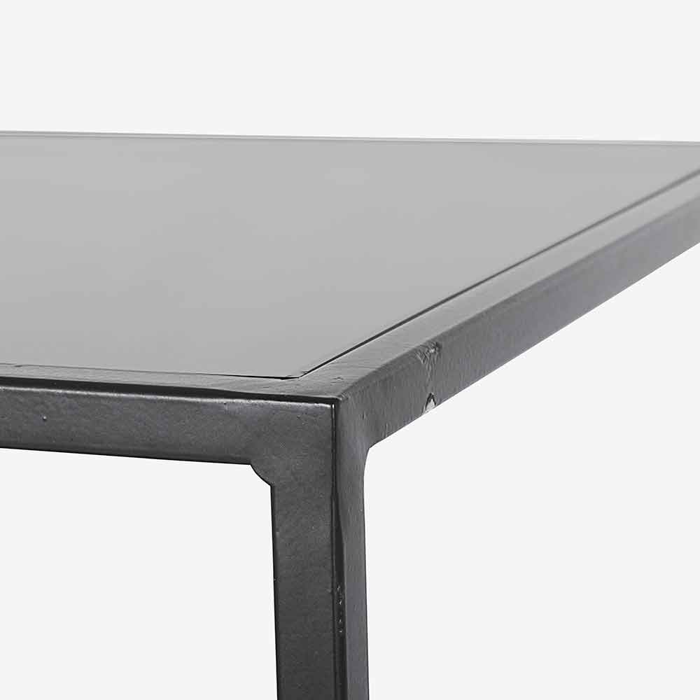 Diese Designkonsole besteht aus einer epoxidpulverbeschichteten Stahlstruktur und einer Glasplatte .