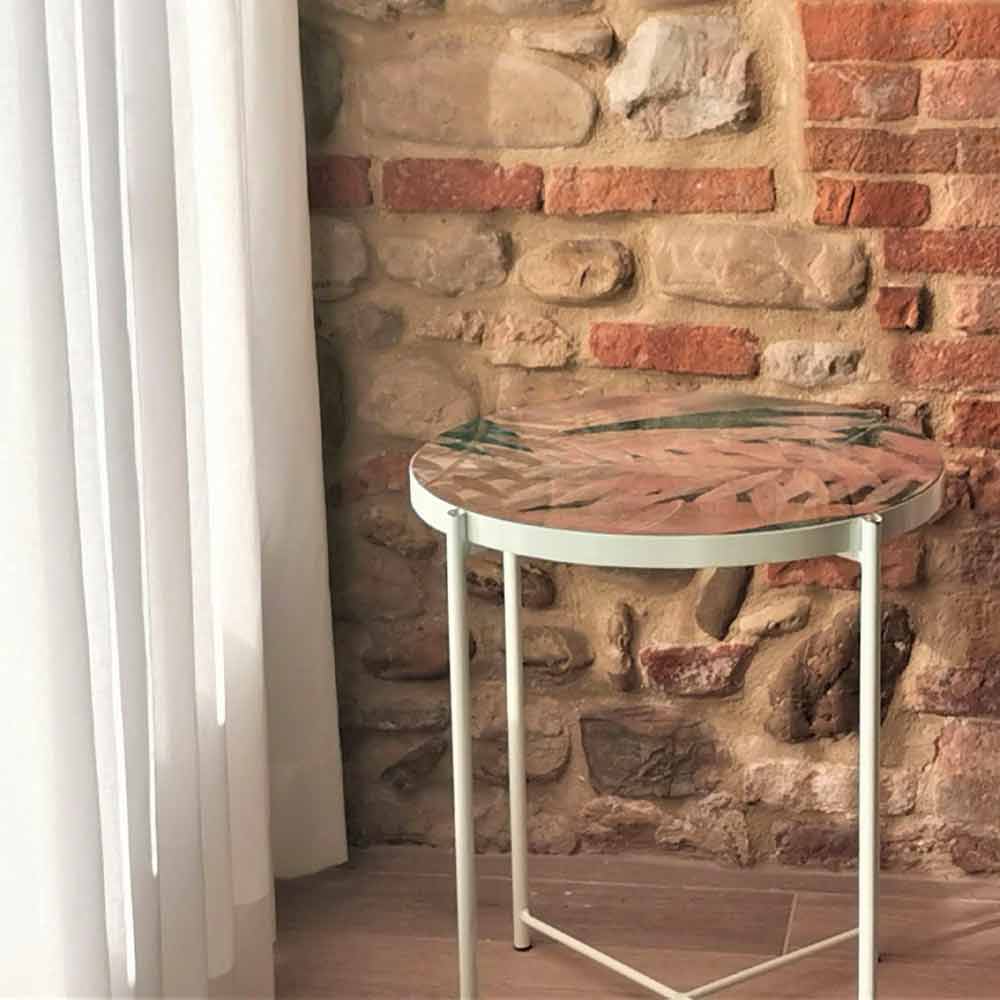 Seine Struktur ist komplett aus pulverbeschichtetem Metall, das für die Verwendung in Innenräumen das Produkt perfekt macht , sondern auch im Freien zu liefern Gärten und Terrassen mit Geschmack und Stil, während die Oberseite von Hand und Harz - Effekt glatt geebnet glänzend verglaster in 6 verschiedenen Ausführungen dekoriert und wird seitlich in eine Metallschale eingeführt und beschichtet. Die Oberseite ist das, was diesen Artikel auszeichnet, da er die Möglichkeit hat, extrahiert zu werden, um so einfach mit den anderen verfügbaren Oberteilen ausgetauscht zu werden, dass dank einer einzigen Basis mehr unterschiedliche Tabellen erhalten werden können.