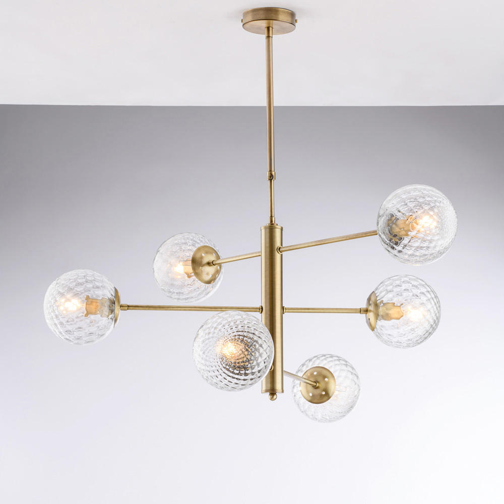 Diese elegante und moderne, handgefertigte Pendelleuchte aus Eisen besticht durch ihre ausgewogene, geometrische Form. Die horizontalen Arme tragen kugelförmige Glasdiffusoren und erzeugen so ein raffiniertes Zusammenspiel von Symmetrien, das ein diffuses, harmonisches Licht verbreitet.