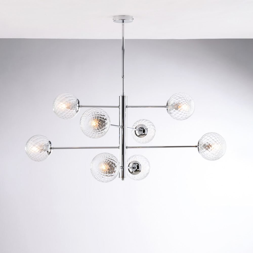 Diese Pendelleuchte ist in poliertem Chrom oder Bronze erhältlich und fügt sich harmonisch in moderne Wohnzimmer , Esszimmer , offene Räume , Designer-Ambiente und Objektbereiche ein. Die Kombination aus Metall und Glas zeugt von der Exzellenz italienischer Handwerkskunst mit besonderer Liebe zum Detail und harmonischen Proportionen.