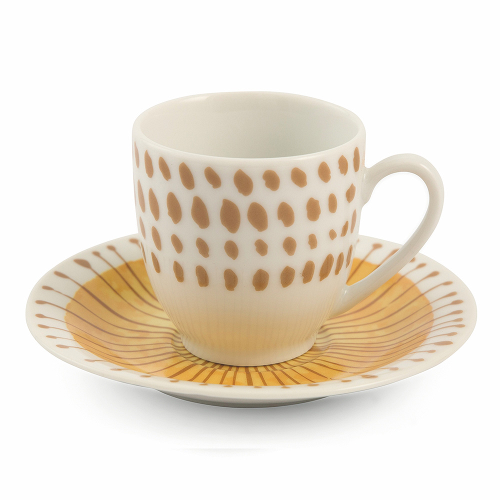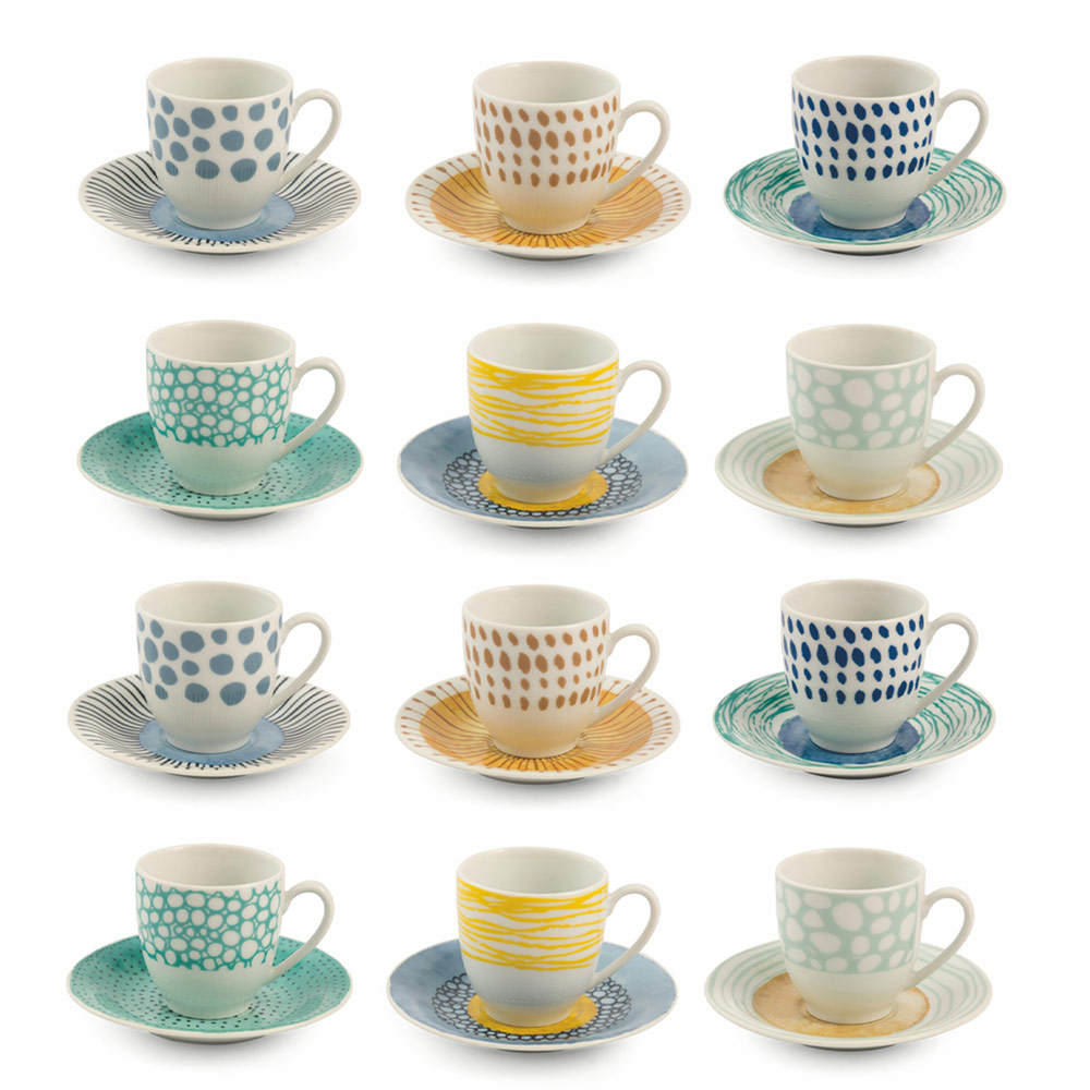 Kaffeetassen-Set aus farbigem Porzellan mit Verzierungen und Untertassen, 12-teilig.