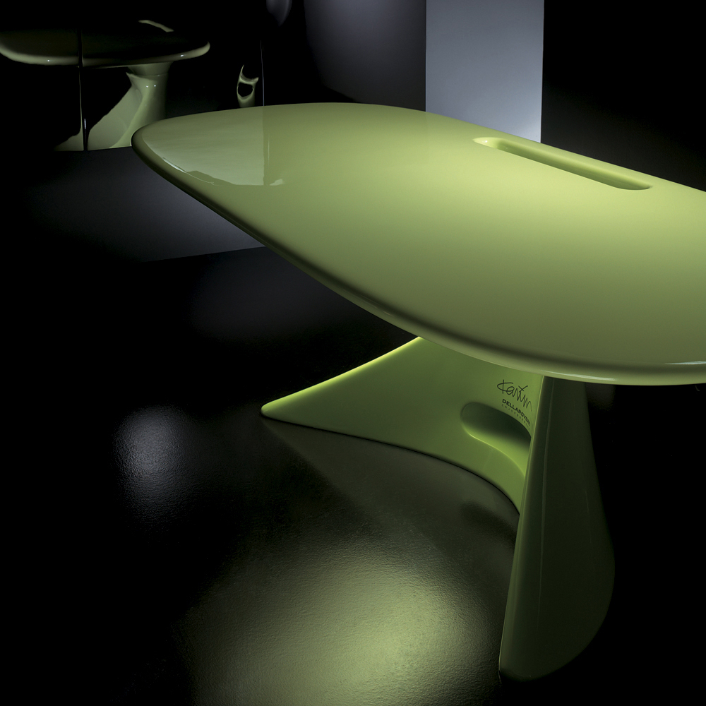 Dieser Schreibtisch verfügt über einen selbsttragenden Körper, der durch Formen von duroplastischen Harzen hergestellt und mit Glasfasern verstärkt wird.