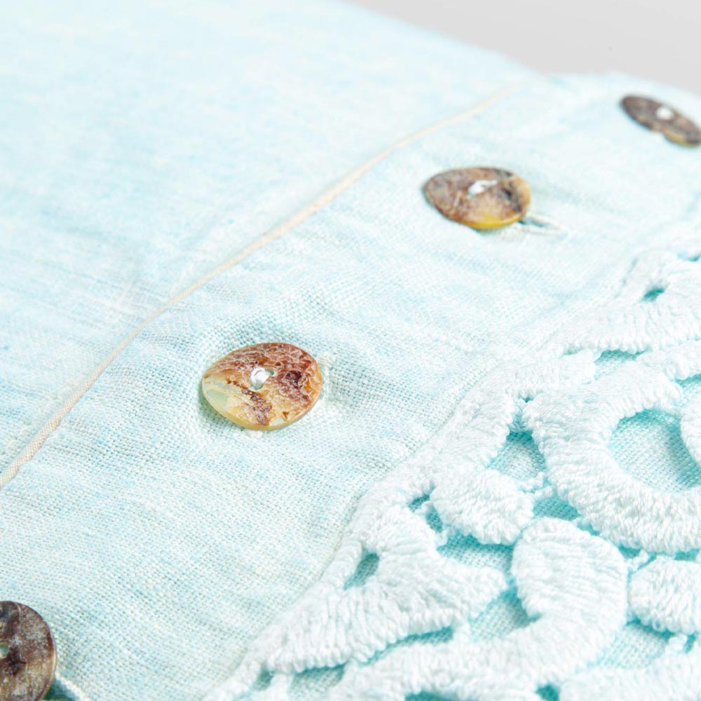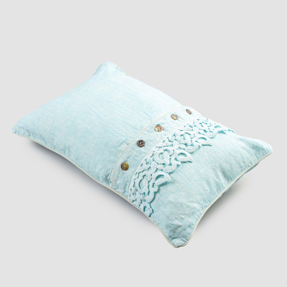 Kissenbezug aus farbigem Leinen mit Gedichtspitze, Knöpfen und Luxuspaspeln made in Italy.