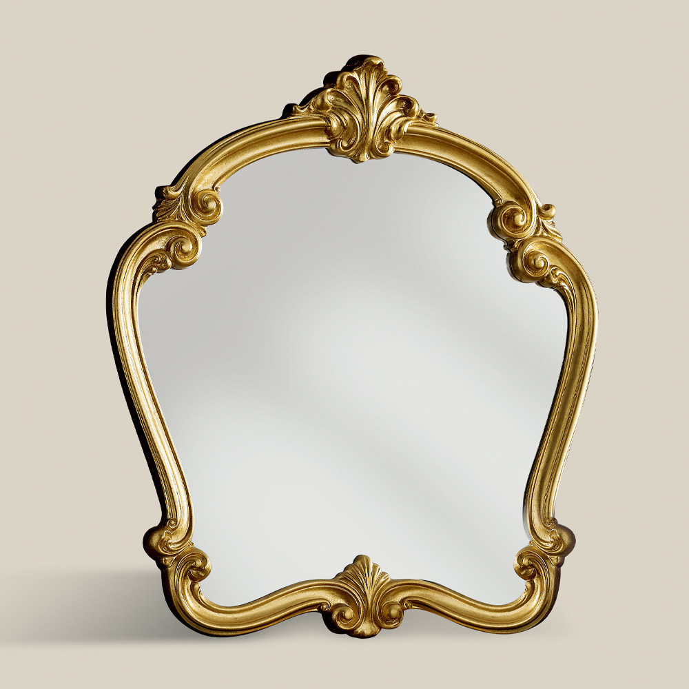Klassischer Spiegel mit geformtem Holzrahmen , der mit Blattgold verziert ist. Mit seinen eleganten und harmonischen Formen ist es ideal, um jeder Umgebung einen klassischen und luxuriösen Touch zu verleihen.