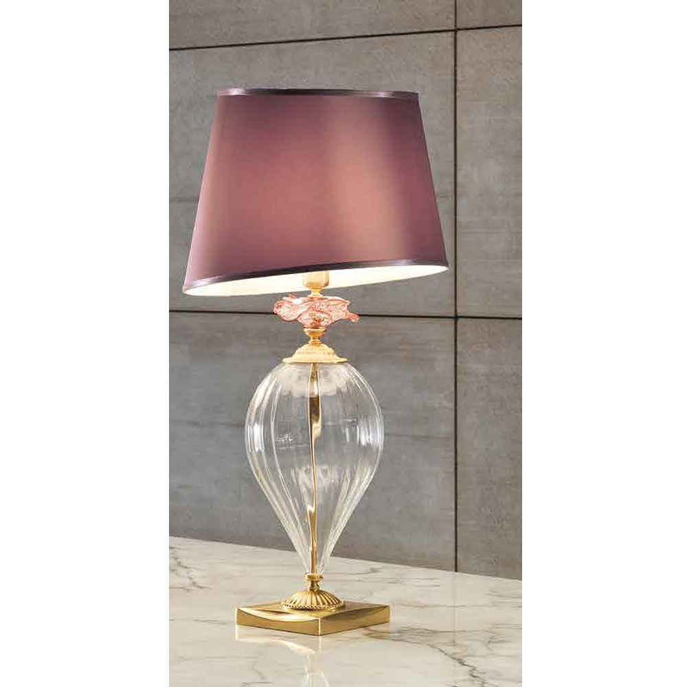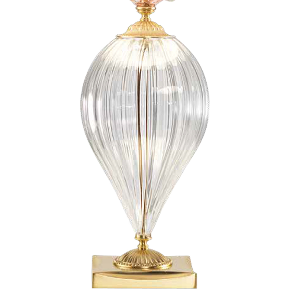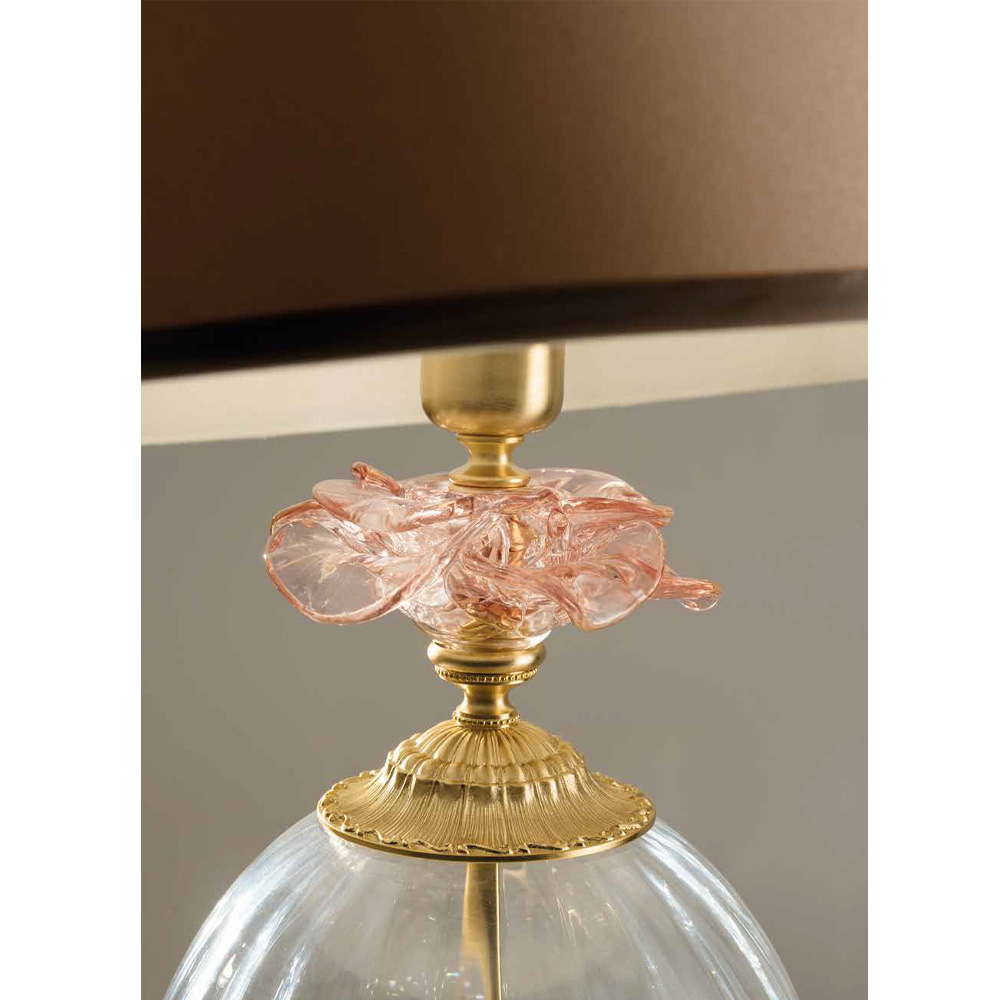 • Körper aus transparentem Glas - Details aus roséfarbenem Glas - satiniertes Goldmetall und roséfarbener Lampenschirm;