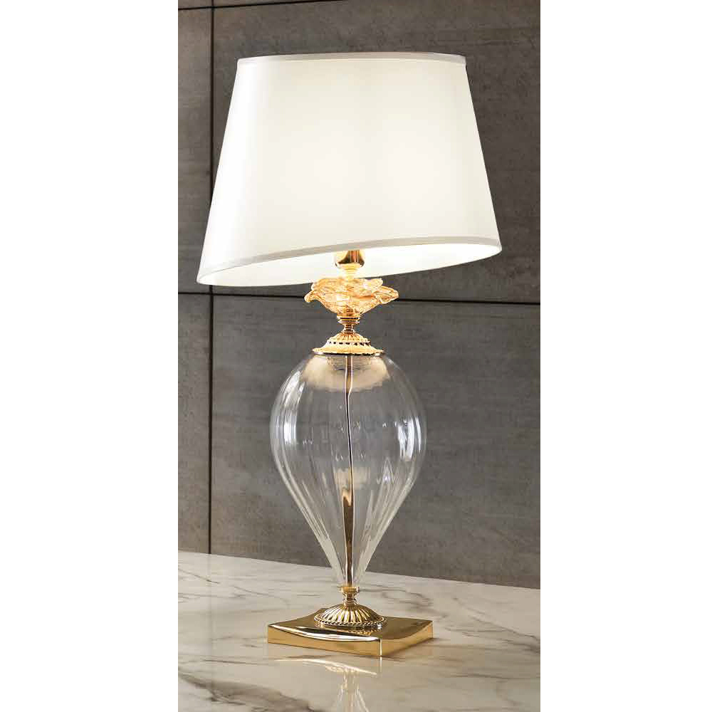 • Transparenter Glaskörper - honigfarbene Glasdetails - glänzendes Goldmetall und cremefarbener Lampenschirm.