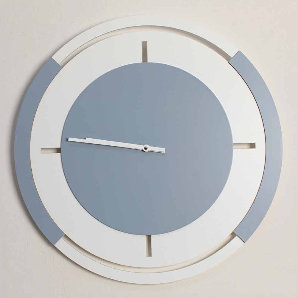 Runde Wanduhr aus weiß und avio lackiertem Holz, modernes Design made in Italy.