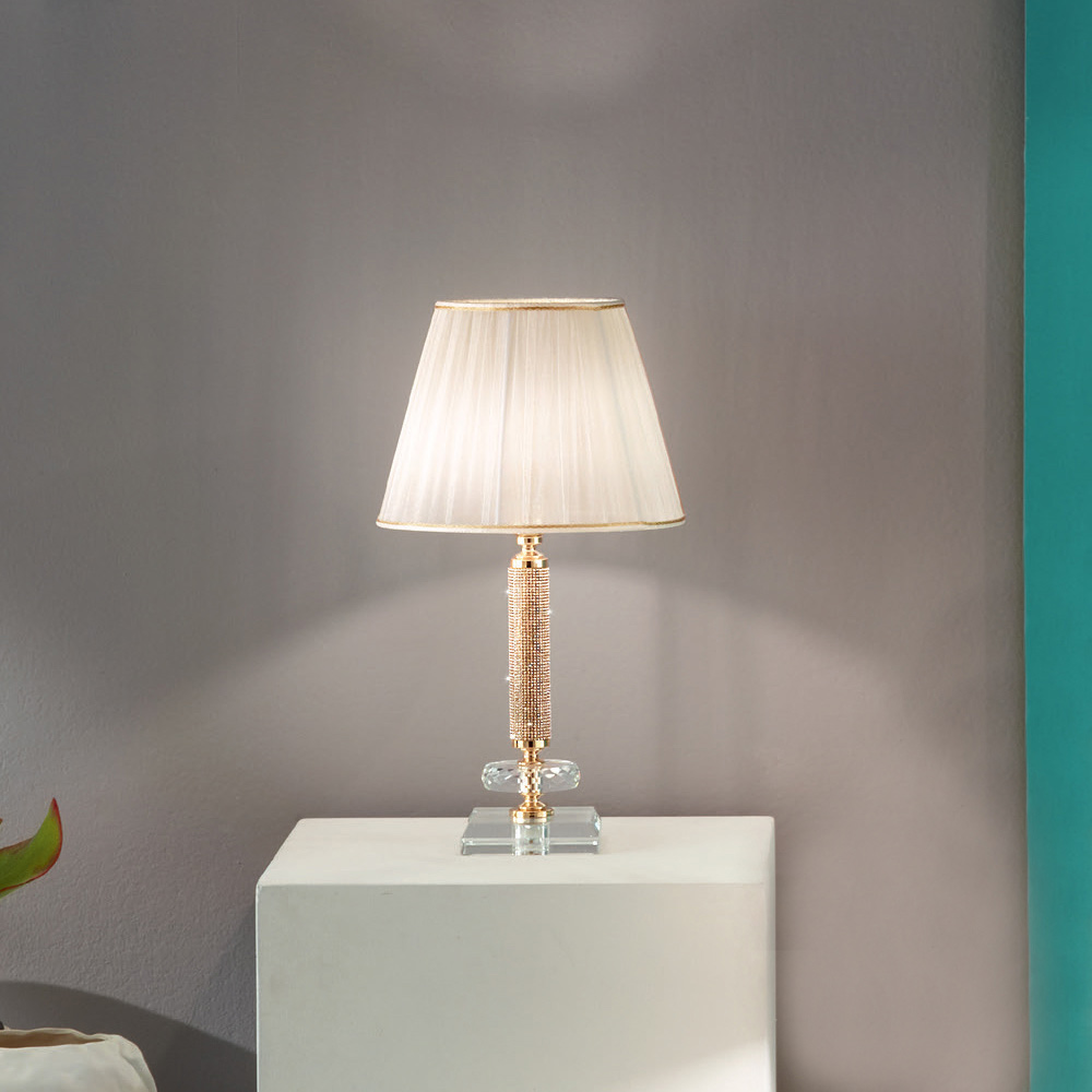 Abgerundet wird das Design durch einen Lampenschirm aus Stoff mit Falteneffekt , der für eine sanfte und gedämpfte Beleuchtung sorgt. Perfekt sowohl für Nachttische im Schlafzimmer als auch für den Schreibtisch eines Büros oder Wohnzimmers im klassischen und eleganten Stil.