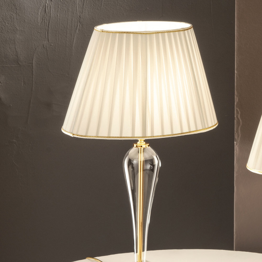 Sie besteht aus einem transparenten Kristallsockel und einem zylinderförmigen Element aus handgefertigtem transparentem Glas. Die kleinen Details und die Lampenfassungsabdeckung bestehen aus goldenem Metall . Der Lampenschirm besteht jedoch aus plissiertem Stoff mit goldenen Verzierungen.