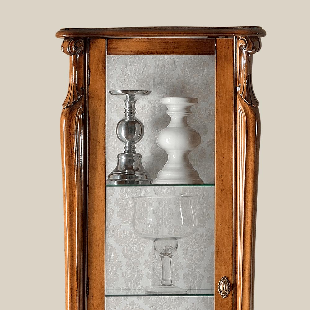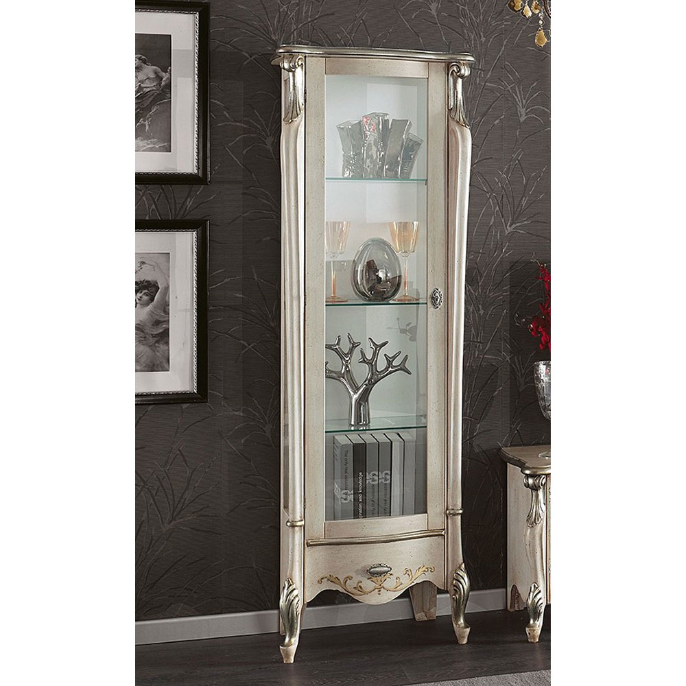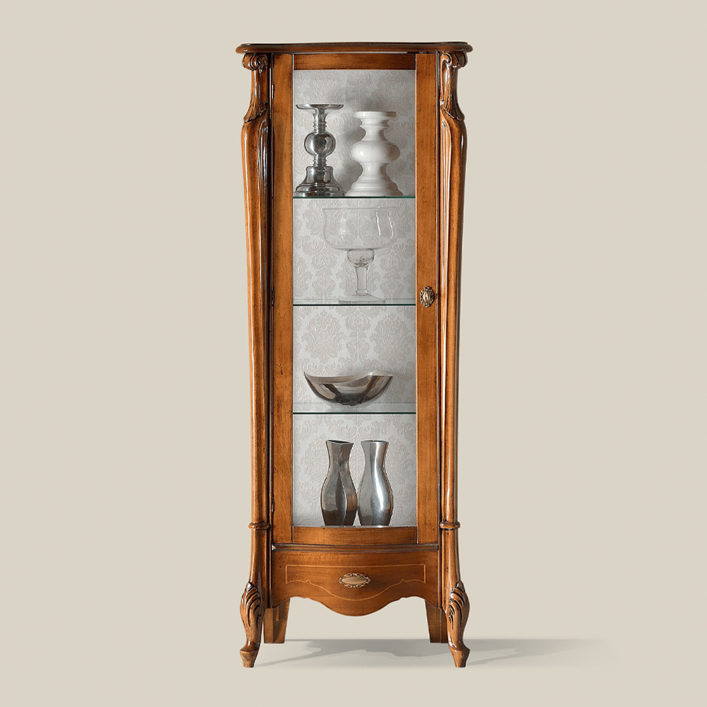Vitrine im klassischen Stil ist perfekt, um ein Wohnzimmer mit Stil und Eleganz zu dekorieren. Er ist aus Holz in Bassano-Nussbaum oder antikweißen Oberflächen gefertigt und hat eine Tür und eine praktische Schublade. Außerdem kann zwischen der Ausführung mit der nach rechts oder nach links zu öffnenden Tür gewählt werden.
