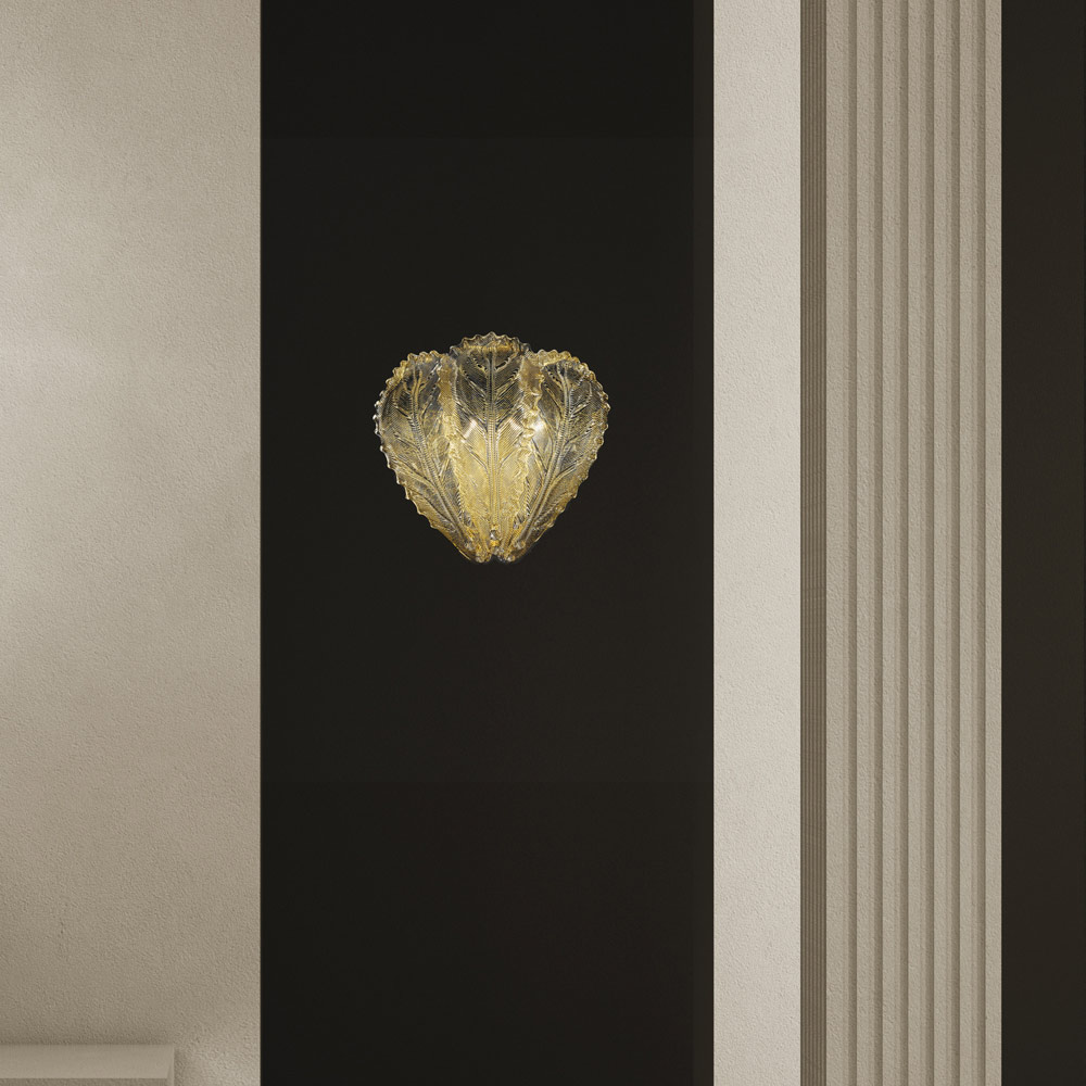 2-flammige Wandlampe aus handgefertigtem Venedig-Glas, 24 Karat Gold-Finish mit glänzenden goldenen Metalldetails . Aus der perfekten Kombination einer eleganten, naturalistischen Inspiration und einer starken funktionalen Seite entsteht eine Einrichtungslösung, die dank ihrer ikonischen Präsenz jede Umgebung charakterisiert, aber gleichzeitig leicht und lebendig ist. Seine Einzigartigkeit wird durch die spezielle Heißbearbeitung unterstrichen, die es ermöglicht, die Adern der Blätter für ein exklusives und edles Ergebnis auf die Oberfläche des Glases zu prägen. Realismus ist mit eleganten Tönen gefärbt, die durch die Anwendung von Ton-in-Ton-Glaskörnungen intensiviert werden und ein echtes Kunstwerk zum Leben erwecken.