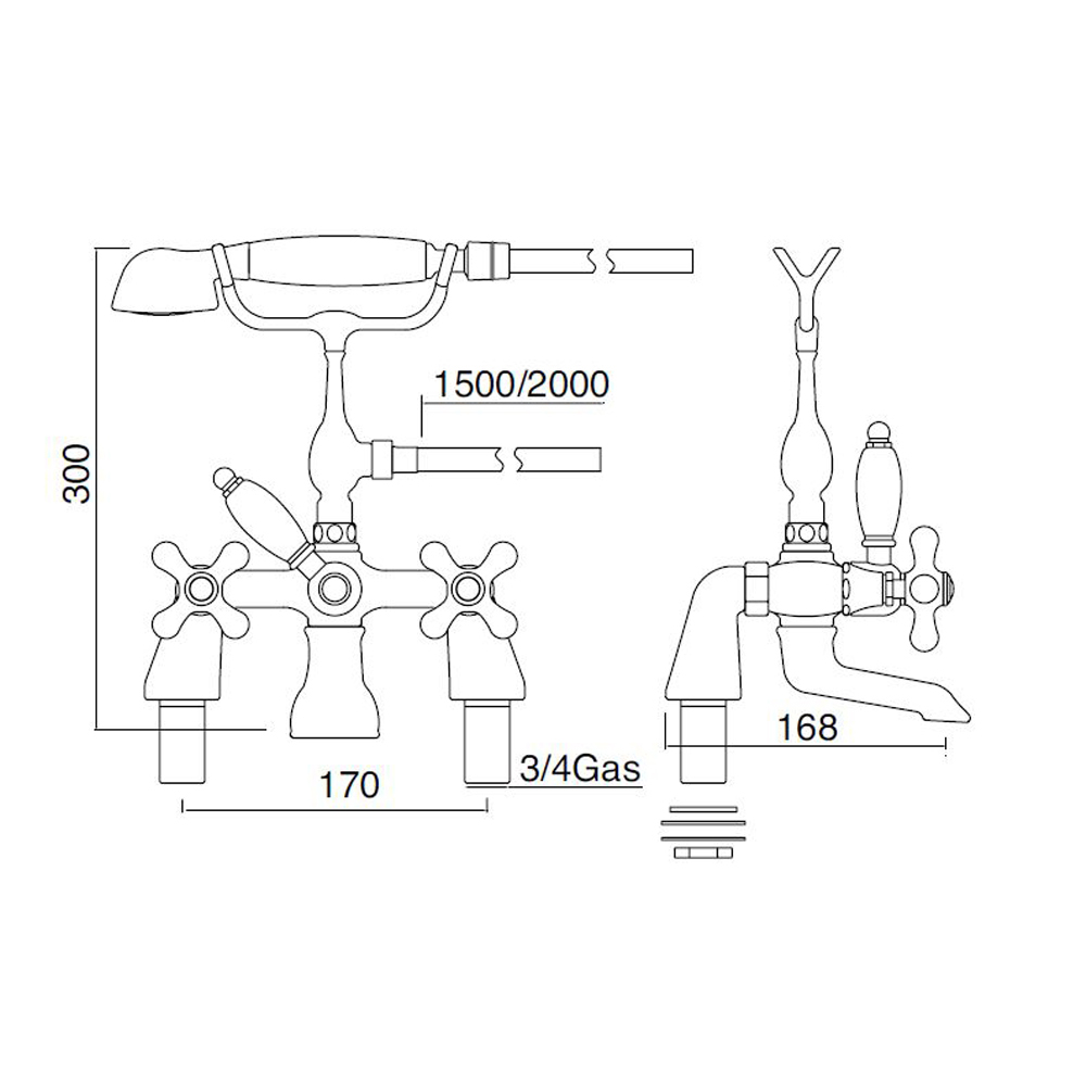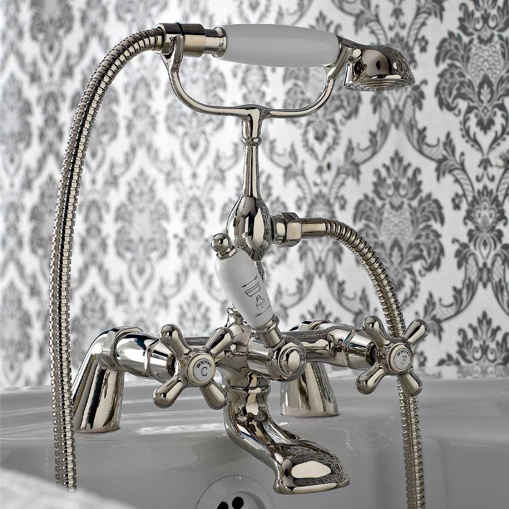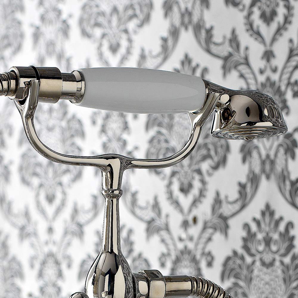 Klassische Badewannenrandarmatur mit Handbrause handgefertigt aus Messing in Italien.