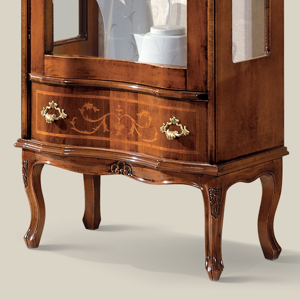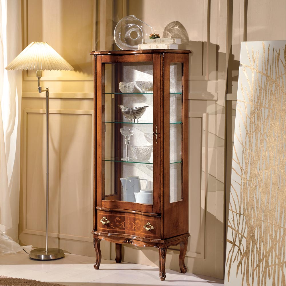 Klassische Wohnzimmervitrine aus Walnussholz mit Tür und Schublade Made in Italy.