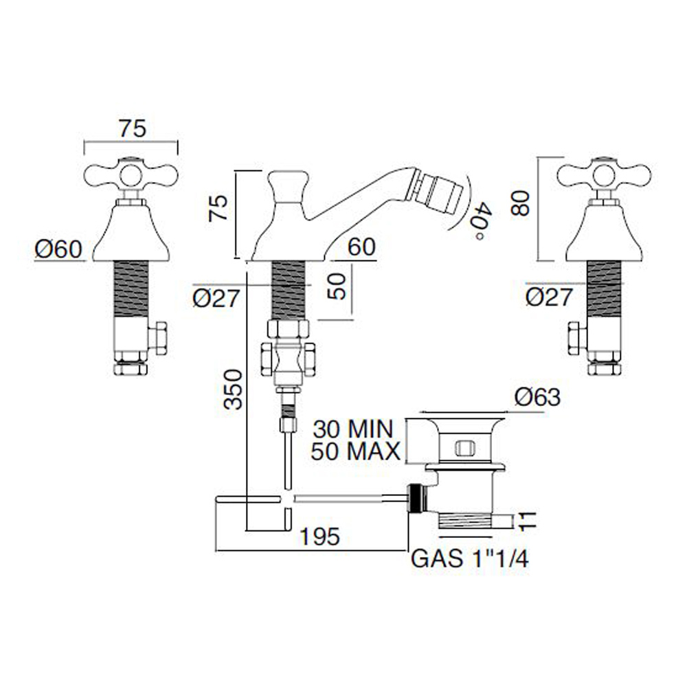 Klassischer 3-Loch-Bidethahn mit Messingablauf Made in Italy - Ercolina