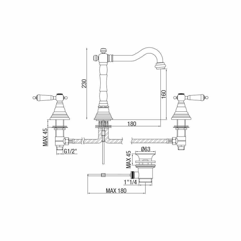 Made in Italy 3-Loch- Waschtischmischer aus Messing mit 1 '' 1/4 Abfluss komplett mit rechter und linker Schraube. Zu seiner Struktur gehört auch der rotierende antike Lauf , während gleichzeitig die Funktionalität erhöht wird , sodass Sie den Wasserstrahl auf einfache und praktische Weise entsprechend Ihren Anforderungen bewegen können.