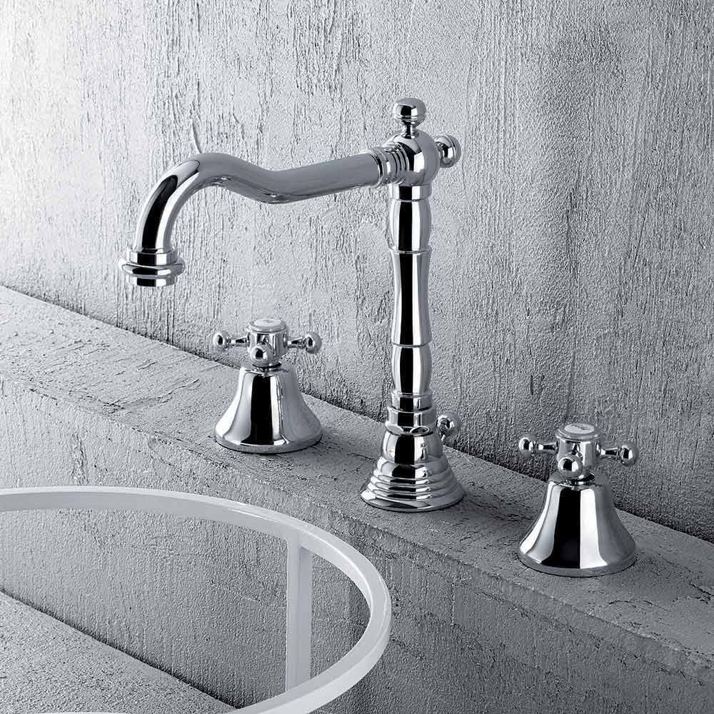 3-Loch-Mixer für Waschbecken im klassischen Design aus Chrom-Messing Made in Italy.