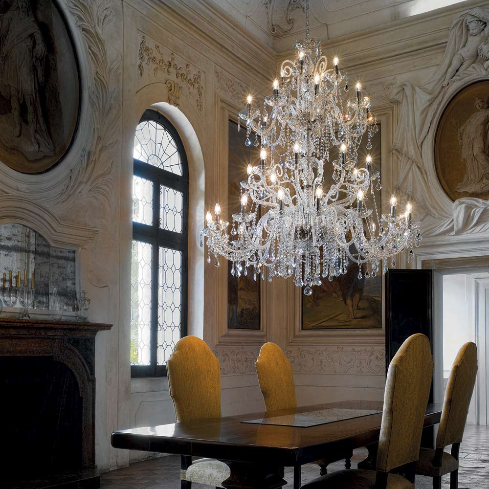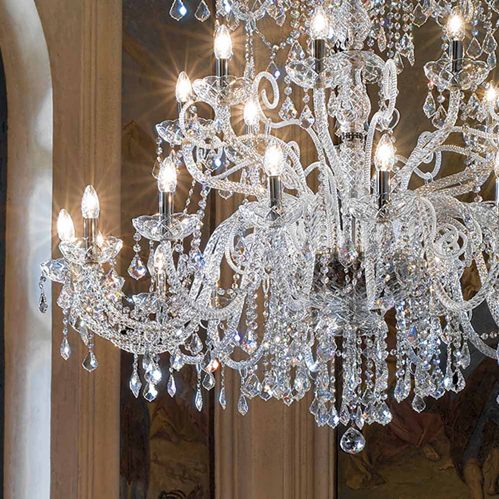 36-flammiger Kronleuchter aus kristallveredeltem venezianischem Glas mit handgearbeiteten Bleianhängern und Details aus poliertem verchromtem Metall . Diese handwerklich hergestellte Ergänzung zeichnet sich durch die wunderbaren Arme aus, die von Hand durch die Drehtechnik bearbeitet wurden, die ein exklusives Ergebnis schafft, das ästhetisch an die Verflechtung eines Seils erinnert und dem Kronleuchter Persönlichkeit verleiht. Ein echter Lichtregen dringt in die Struktur des Kronleuchters ein und breitet sich dann durch Brechung durch die Magie von Pailletten und Kristallanhängern mit feinen Oberflächen in der Umgebung aus und erzeugt so einen eindrucksvollen und traumhaften szenografischen Effekt , der verzaubern und überraschen kann. für seine Eleganz und Majestät .