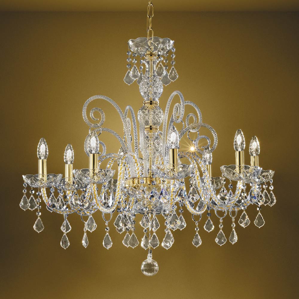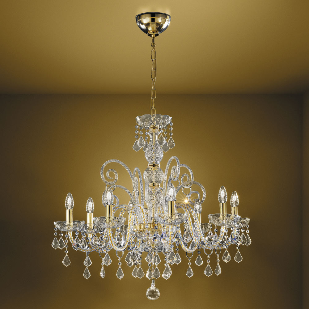 Kronleuchter aus venezianischem Glas mit 8 Lichtern in Kristall-Finish mit Bleianhängern und glänzendem goldenem Metall . Diese handwerklich hergestellte Ergänzung zeichnet sich durch die wunderbaren Arme aus, die von Hand durch die Verdrehungstechnik bearbeitet wurden, wodurch ein exklusives Ergebnis entsteht, das ästhetisch an die Verflechtung eines Seils erinnert und dem Kronleuchter Persönlichkeit verleiht. Ein echter Lichtregen dringt in die Struktur des Kronleuchters ein und breitet sich dann durch Brechung durch die Magie von Pailletten und Kristallanhängern mit feinen Oberflächen in der Umgebung aus und erzeugt so einen eindrucksvollen und traumhaften szenografischen Effekt , der verzaubern und überraschen kann. für seine Eleganz und Majestät .