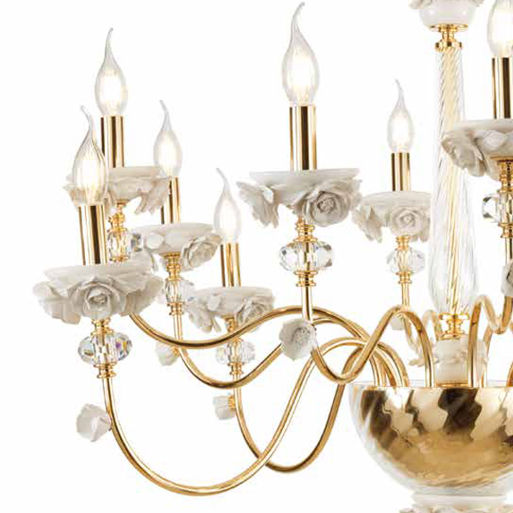 Kronleuchter mit 12 Lichtern aus Porzellan und mundgeblasenem Glas, Luxus made in Italy.