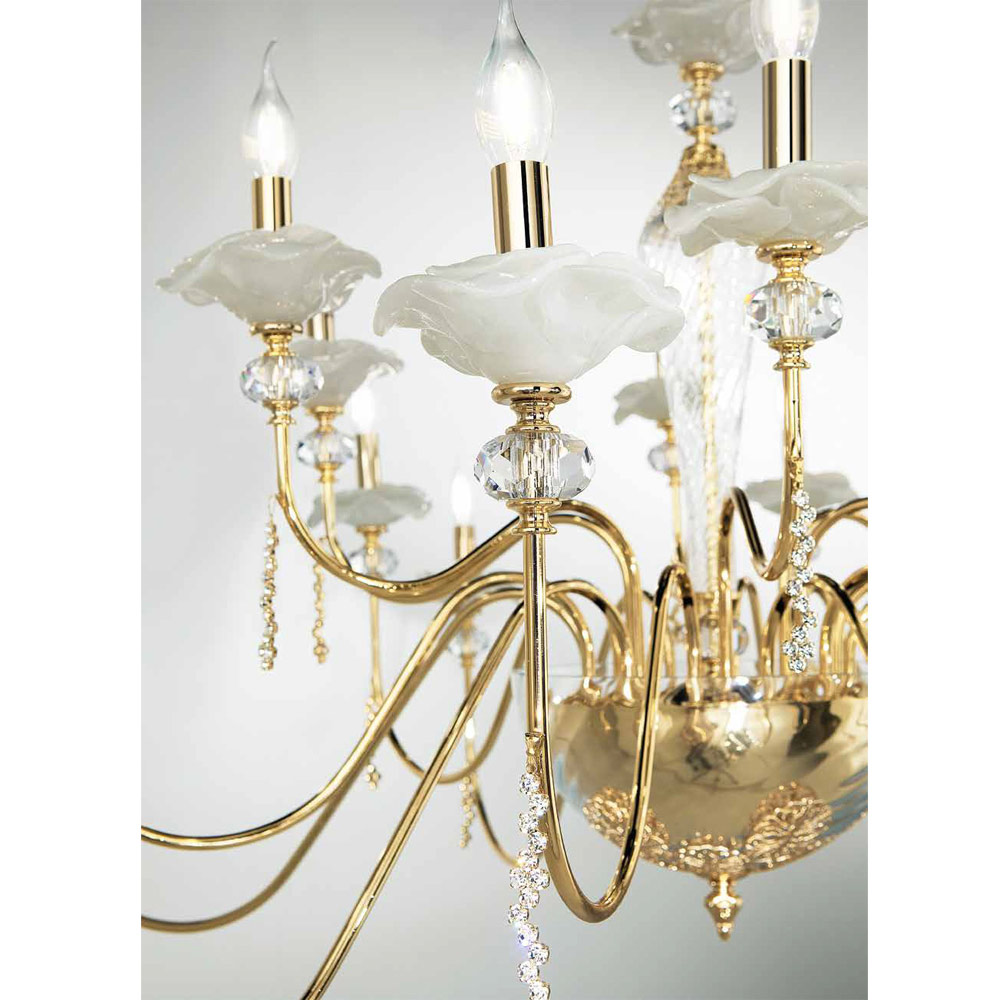 Was es einzigartig und majestätisch macht, sind die Knospen aus handgefertigtem Glas von höchster Qualität und die Juwelendetails aus Kristall , die an die ebenfalls handgefertigten Tautropfen erinnern, die einen klassischen Stil der Vergangenheit zum Leben erwecken, dessen Charme zum Protagonisten wird der Zielraum.