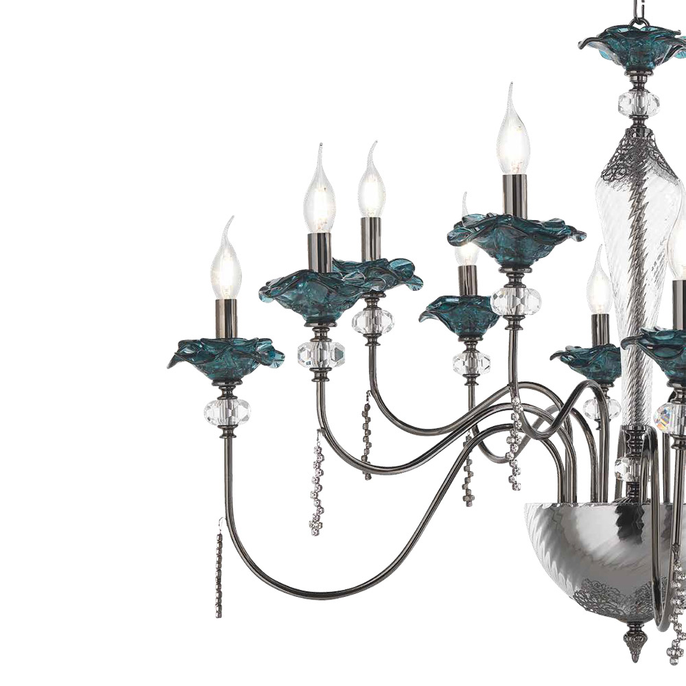 Der 18-Licht- Kronleuchter ist ein luxuriöses Beleuchtungszubehör , das vollständig in Italien handgefertigt wird und eine Metallstruktur mit Silberschweißung aufweist.