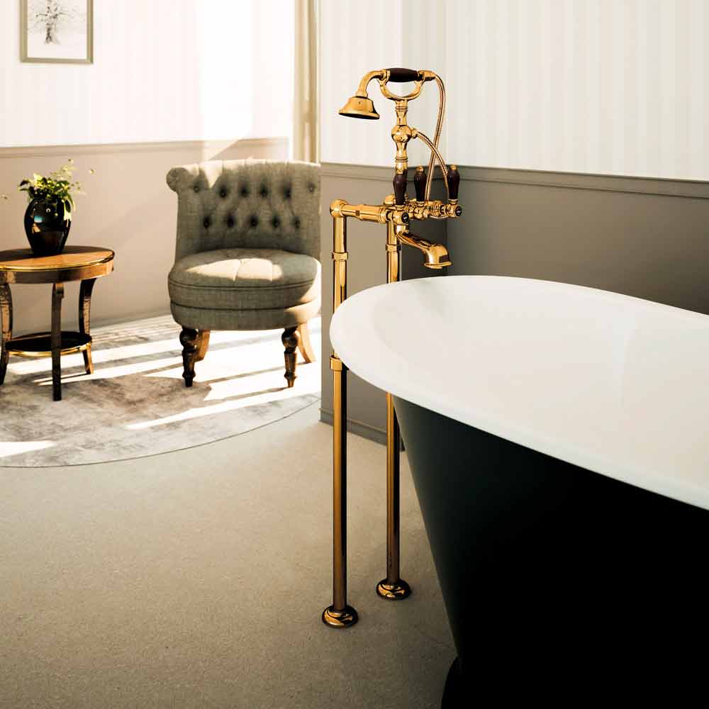 - Deluxe Gold: poliertes 14-antikes Gold-Finish mit weißen Keramikeinsätzen an den Griffen;