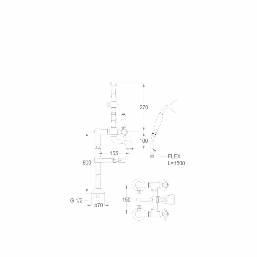 Freiliegender Bademischer auf Bodensäulen mit Umstellung und Duplex-Handbrause Made in Italy.
