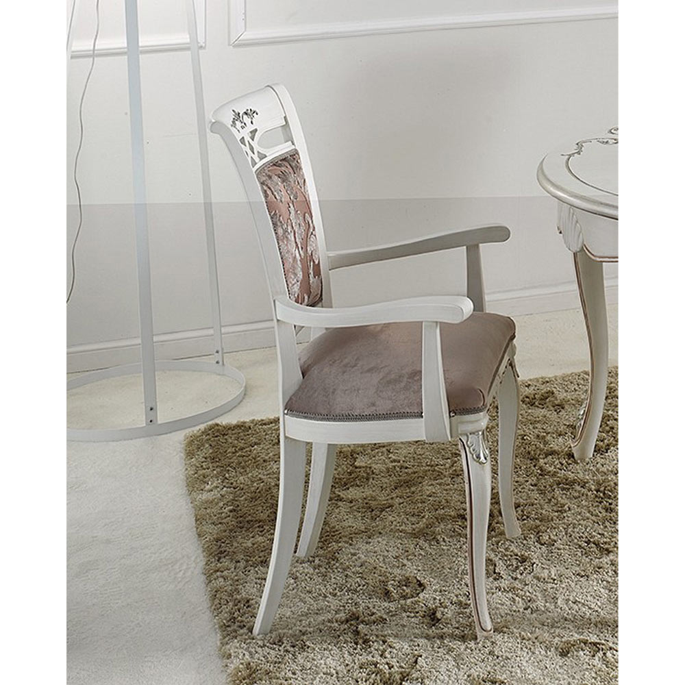 Weiß und Silber . Dieser Stuhl hat einen gepolsterten Sitz und eine mit Stoff bezogene Rückenlehne, um sich durch optimalen Komfort an alle Bedürfnisse anzupassen, und es ist auch möglich, zwischen der Version mit oder ohne Armlehnen zu wählen. Eine einzigartige und raffinierte Ergänzung, vollständig