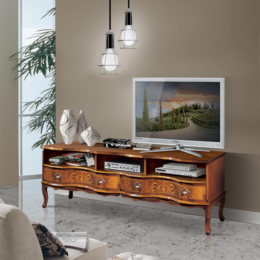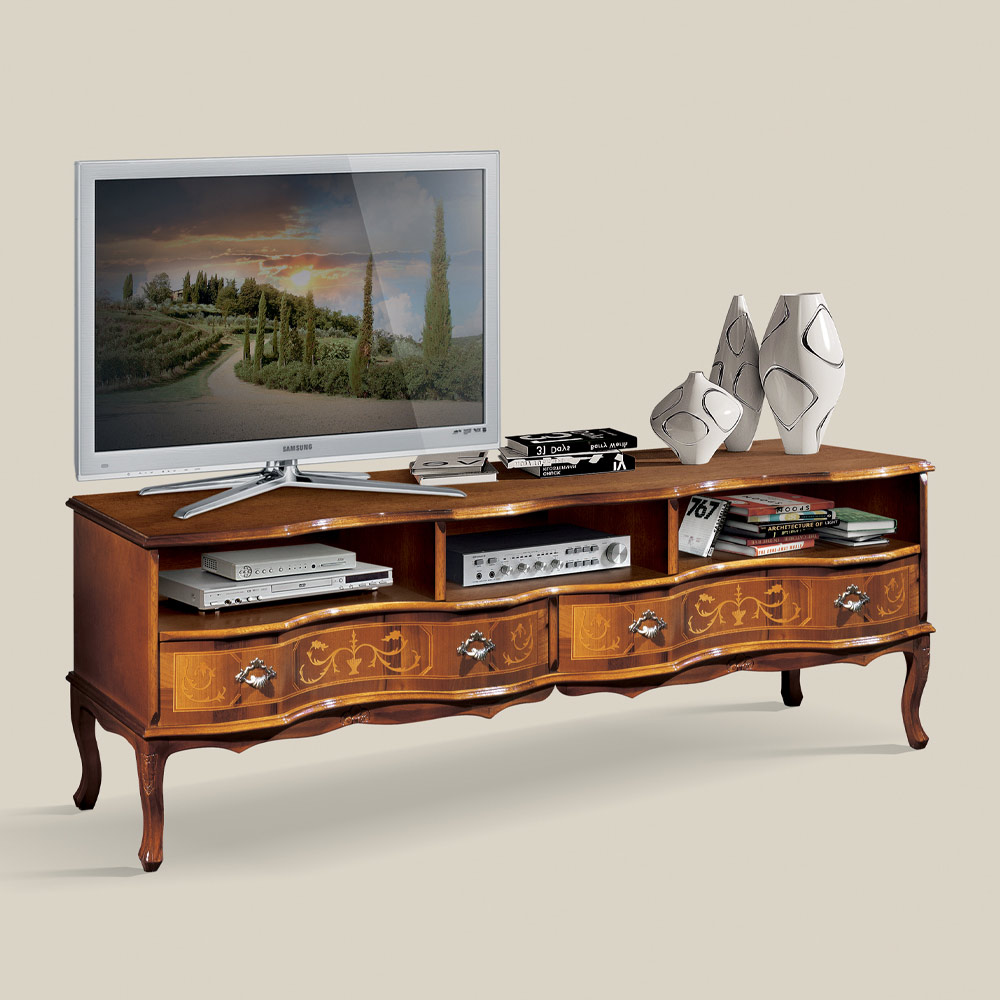 TV-Ständer aus Holz im klassischen Stil mit Fächern und Schubladen, Made in Italy.