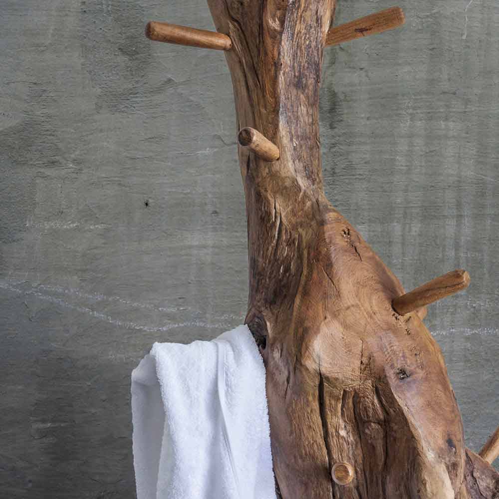 Kleiderbügel, Kleiderhaken und Handtuchhalter aus massivem Burma Teak aus Baumstämmen. Sockel und Heringe aus Teakholz.