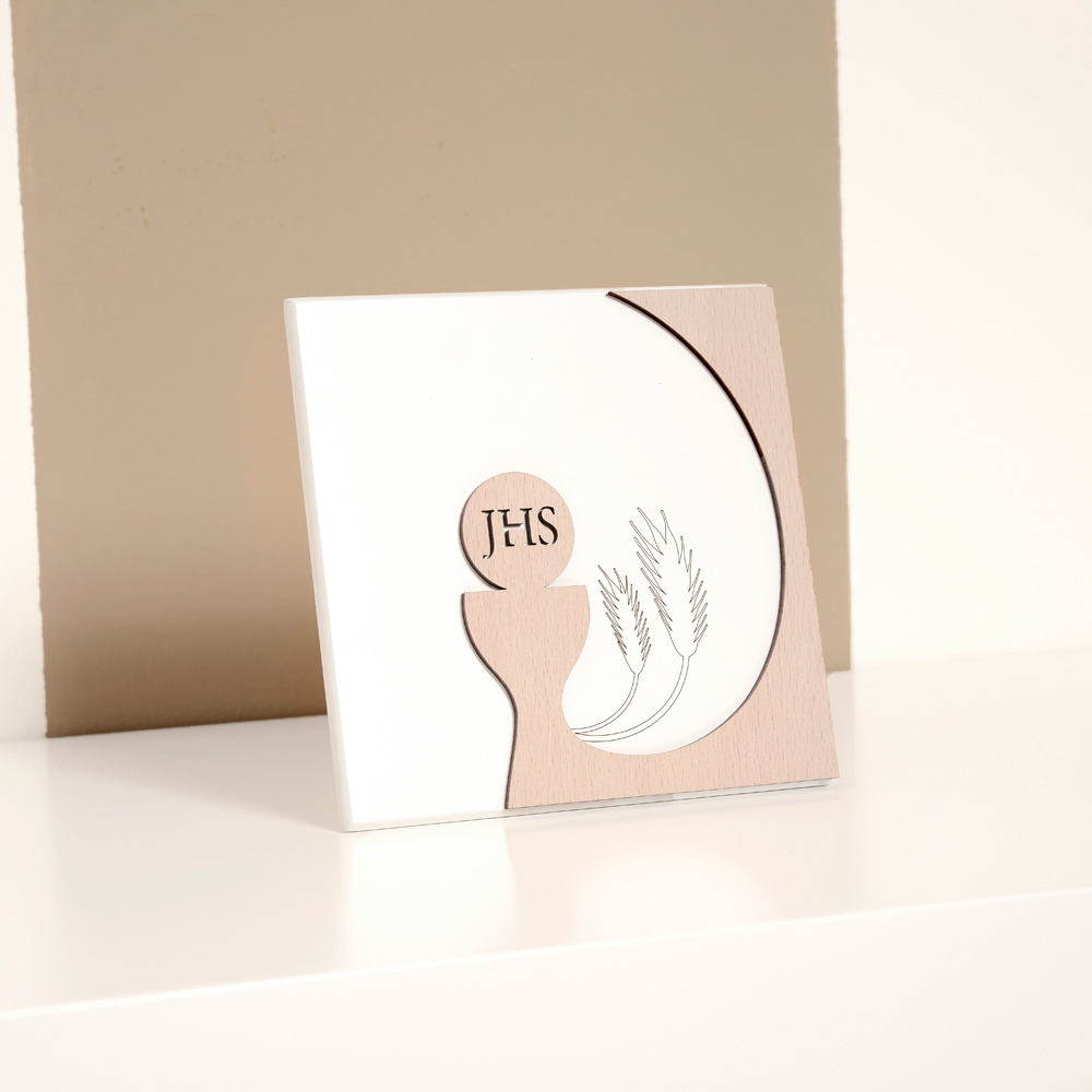 Die italienischen Handwerksmeister haben hart daran gearbeitet, einfache und lineare Oberflächen zu schaffen, die die Symbole der Eucharistie, des Kelchs und der Hostie mit Ähren hervorheben sollen. So entstand ein einfaches, aber optisch auffälliges Produkt, das man verschenken oder als Erinnerung an einen besonderen Moment darstellen kann.