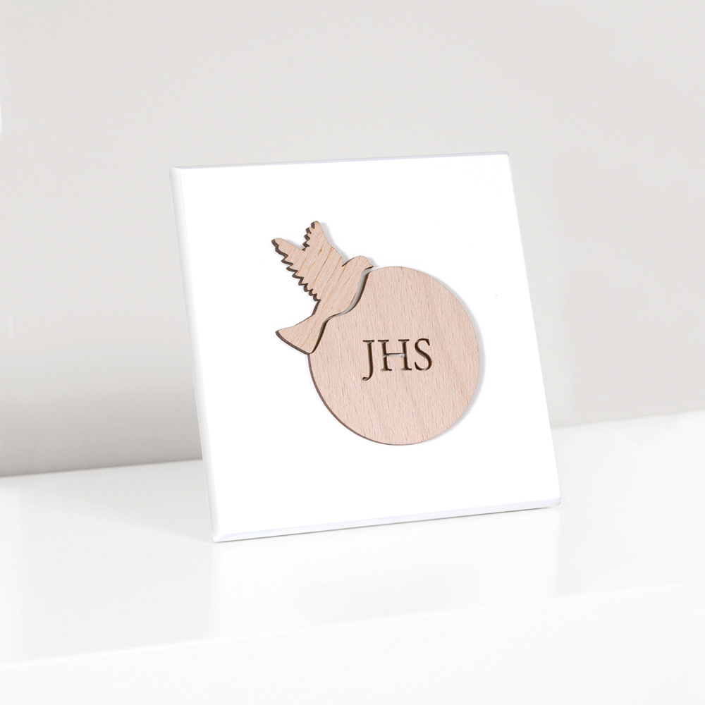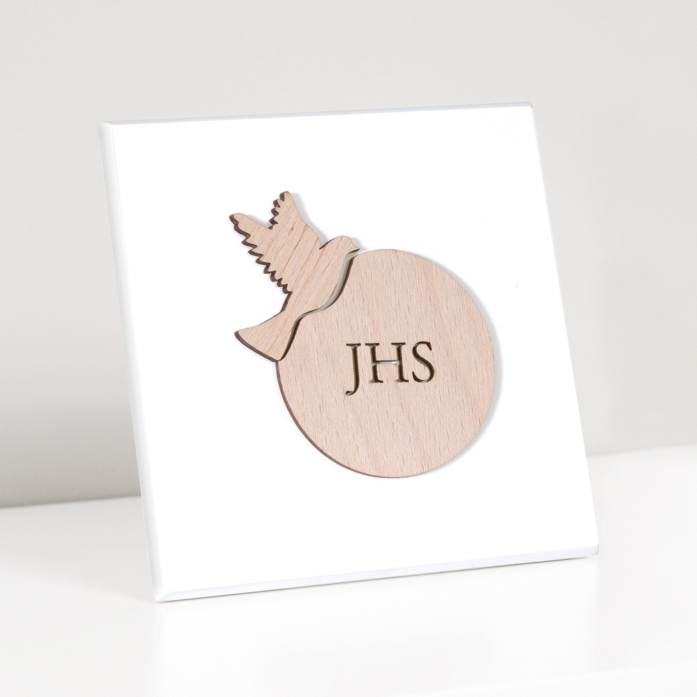 Heiligenbild mit Hostie und Firmungstaube aus Naturholz appliziert. Weiß lackierte Holzplatte mit Stützfuß und Loch zum Aufhängen an der Wand.