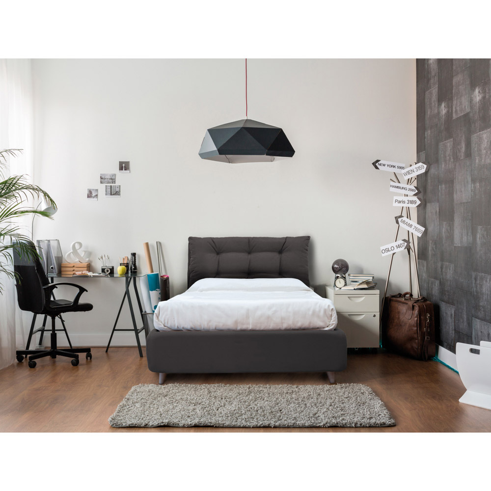 Modell ohne Ringbehälter: gepolsterter Bettrahmen mit unterstützter Basis inklusive und bequemem 11 cm hohen Fuß, der die Reinigung unter der Struktur ermöglicht.