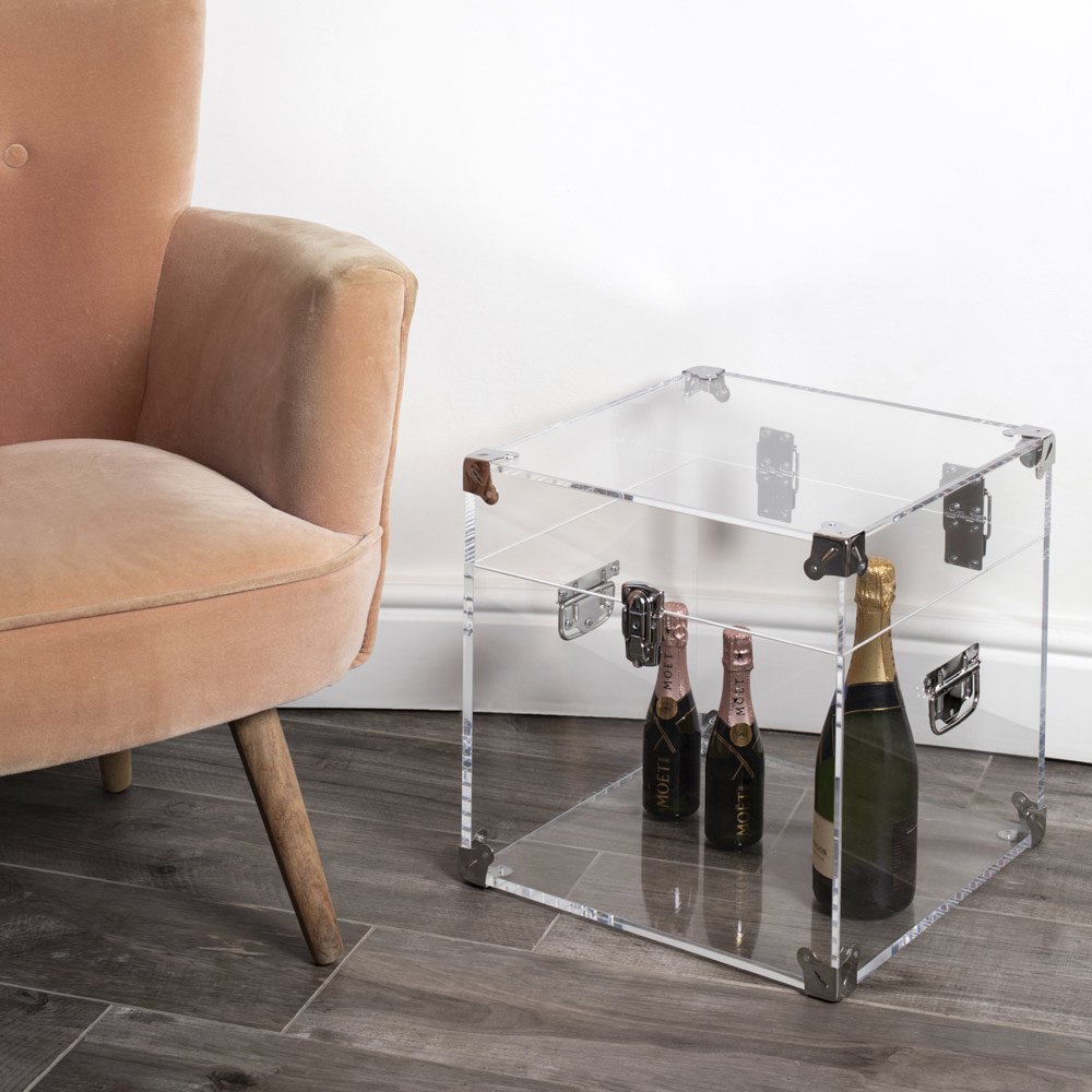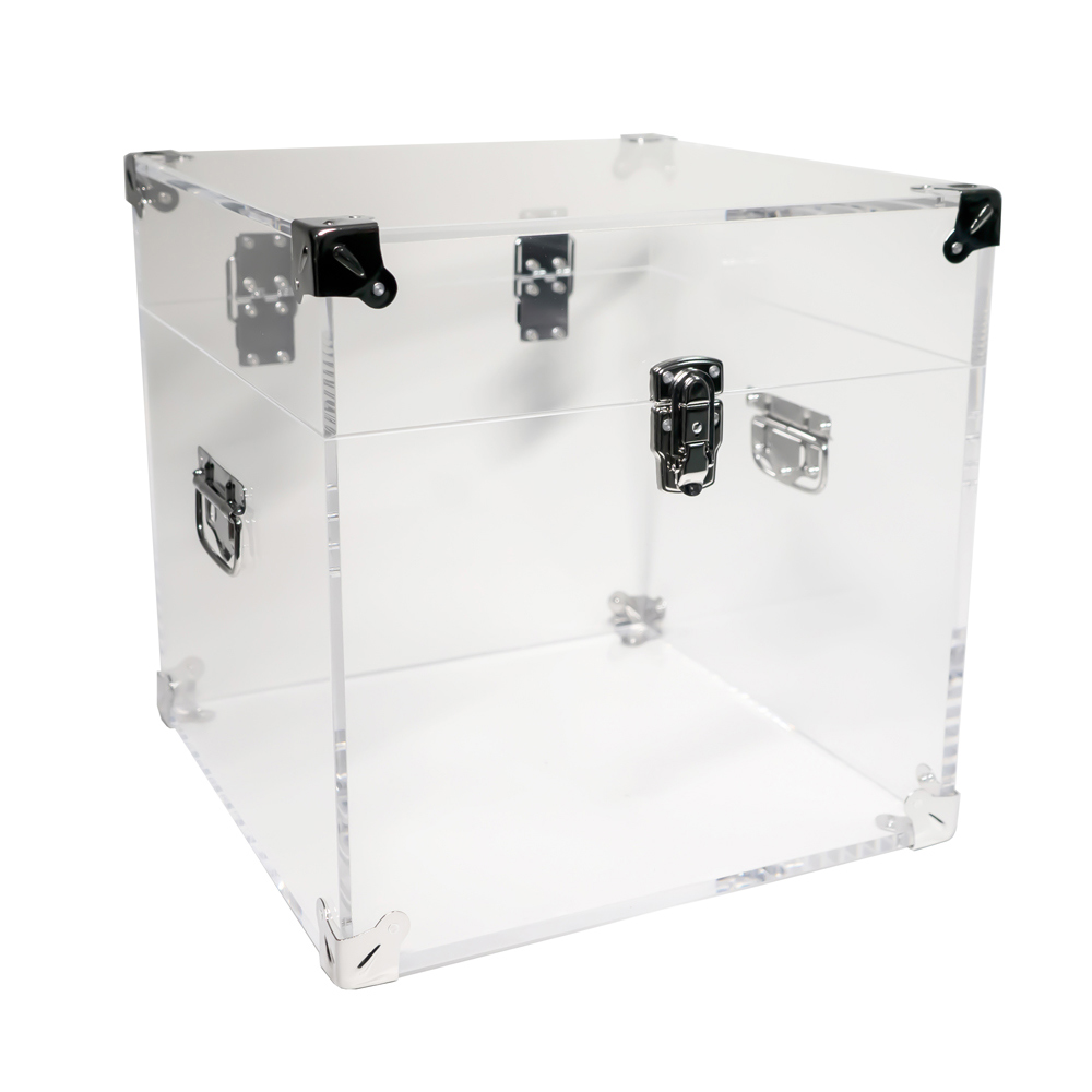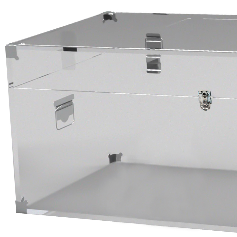 Dieser Koffer besteht vollständig aus gefaltetem Acrylglas, erhältlich in 2 Varianten mit einer Dicke von 10 mm, vollständig UV-verklebt mit edlen verchromten Stahloberflächen.