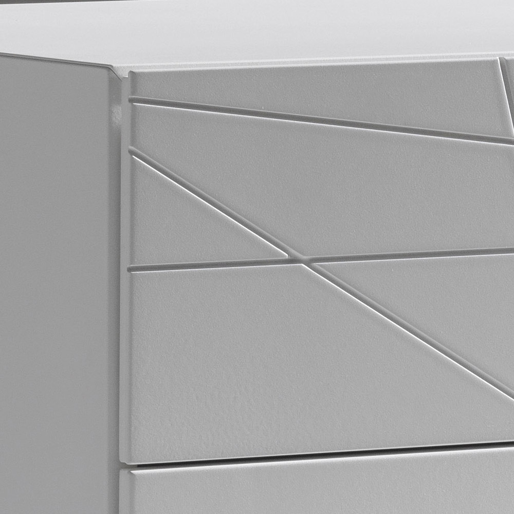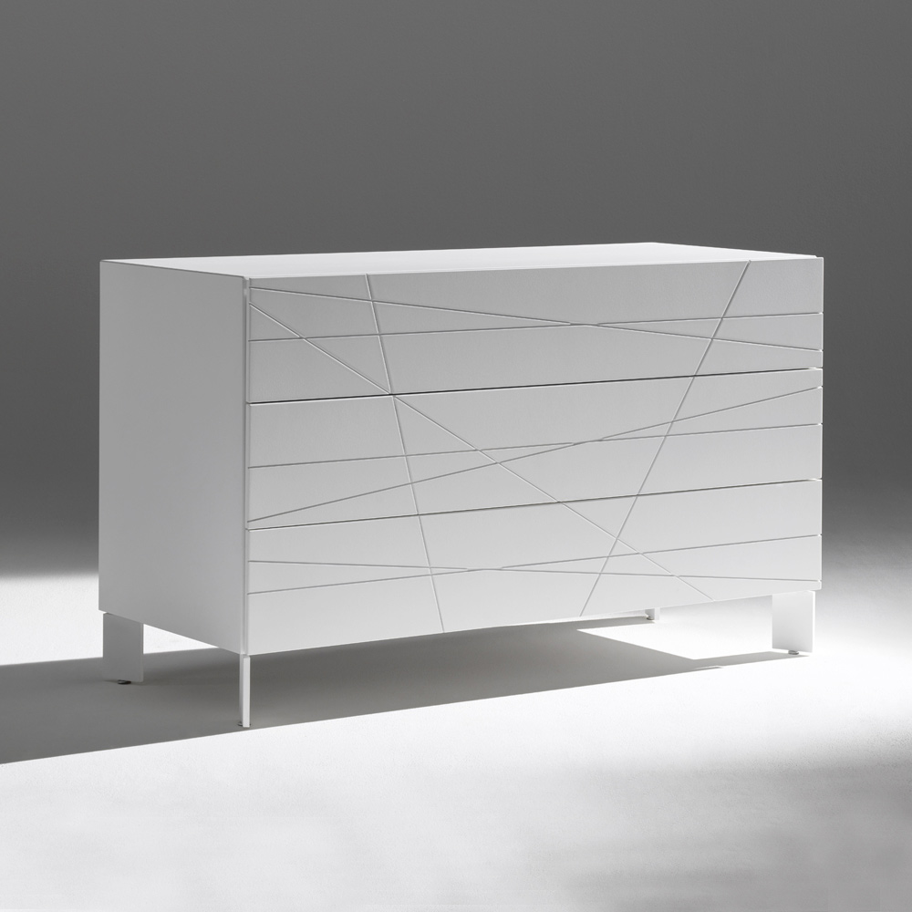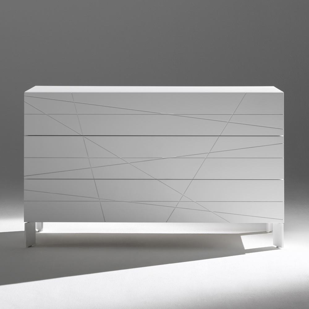 Eine Kommode mit modernem, klarem Design, die sich durch eine markante grafische Gestaltung und geradlinige Formen auszeichnet. Die geometrischen Einschnitte an den Fronten erzeugen ein elegantes Linienspiel, das mit dem Licht interagiert und die Kommode zu einem echten Blickfang im Schlafzimmer macht.