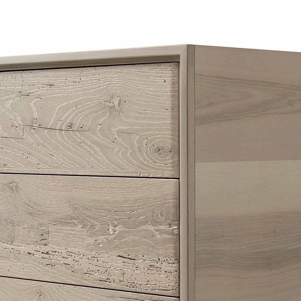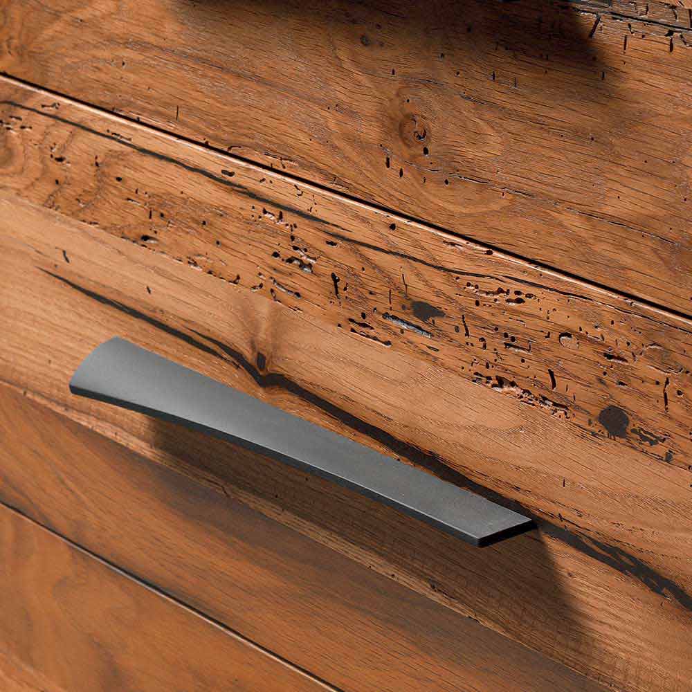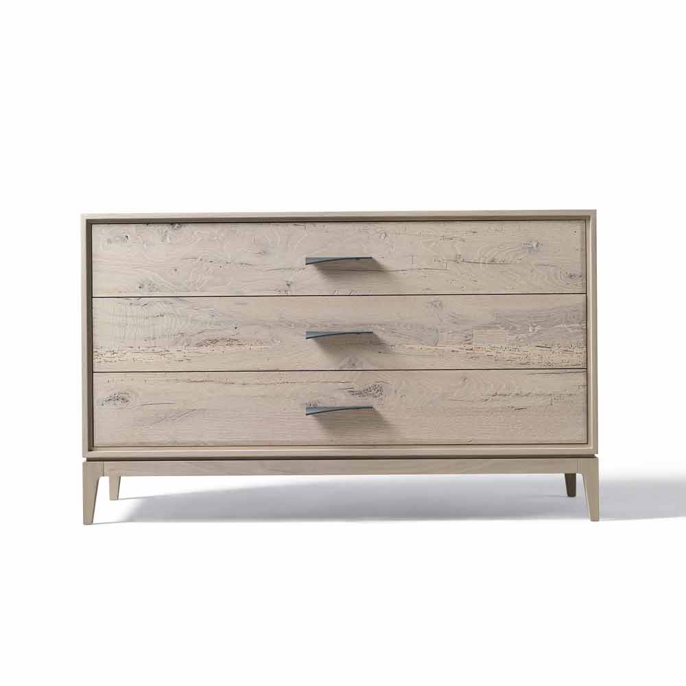 Im Detail das natürliche Erscheinungsbild der Kommode mit 3 Schubladen. Das präzise Ölfinish, das die Maserung des Holzes erhöht, ist das Ergebnis handwerklicher Handwerkskunst. Die besondere Form des Griffs verleiht dem Möbel einen Charakter und eine Persönlichkeit.