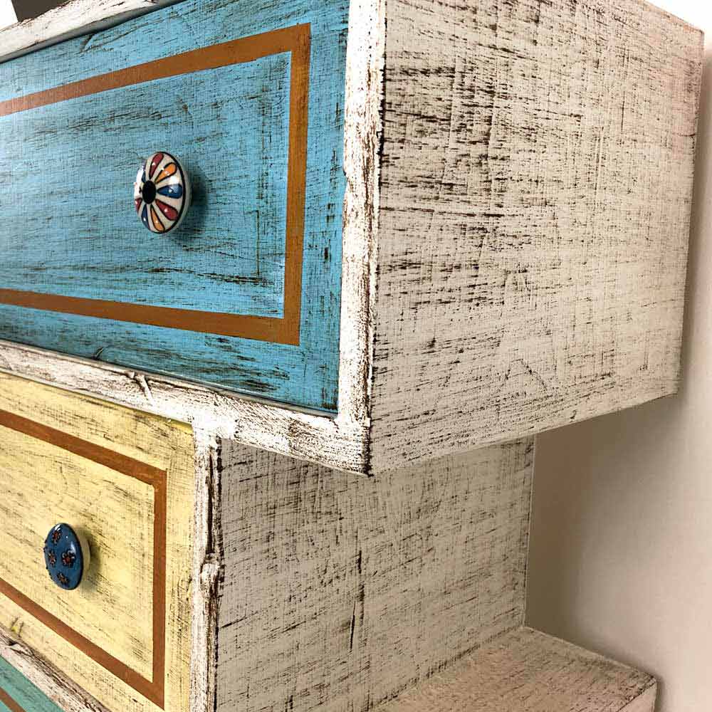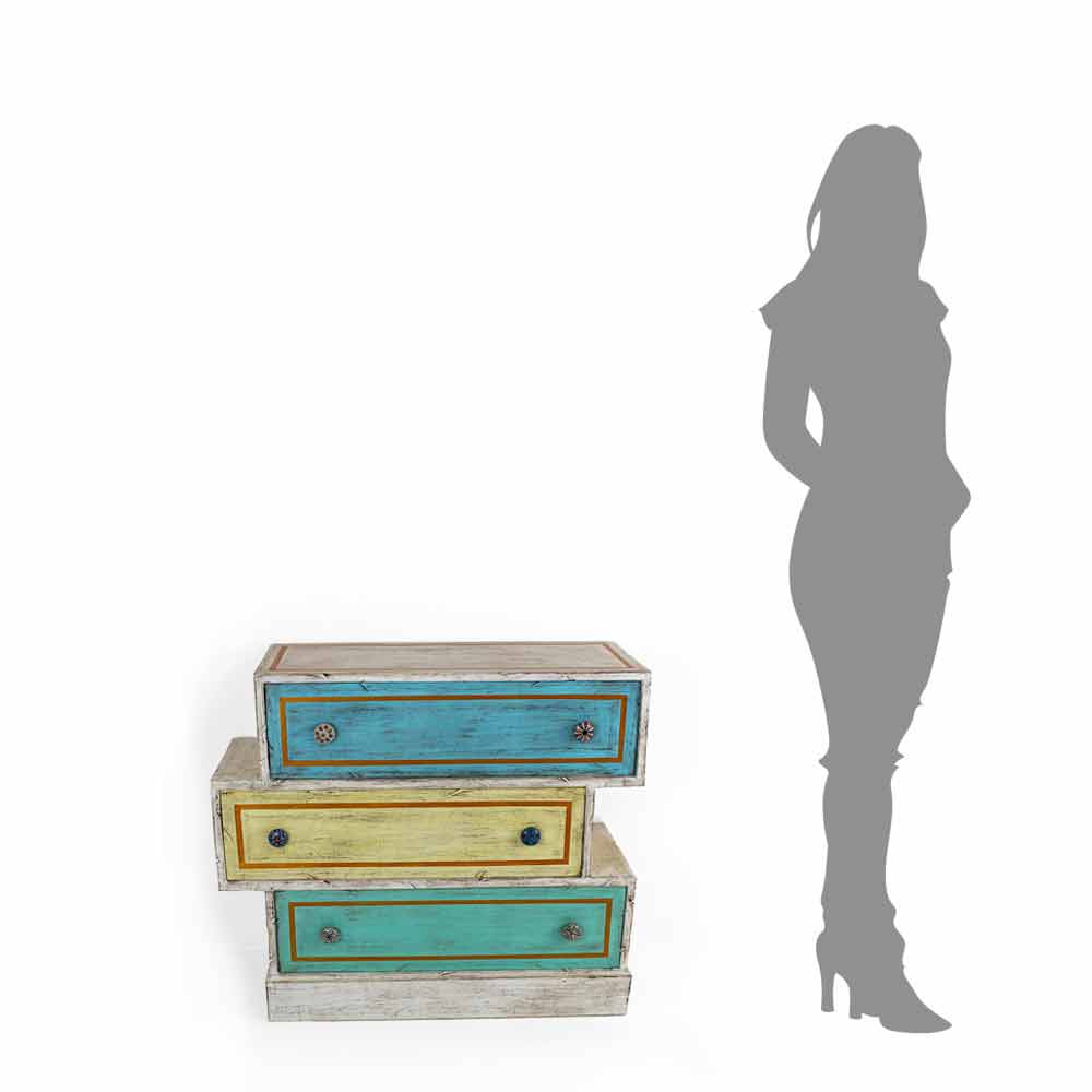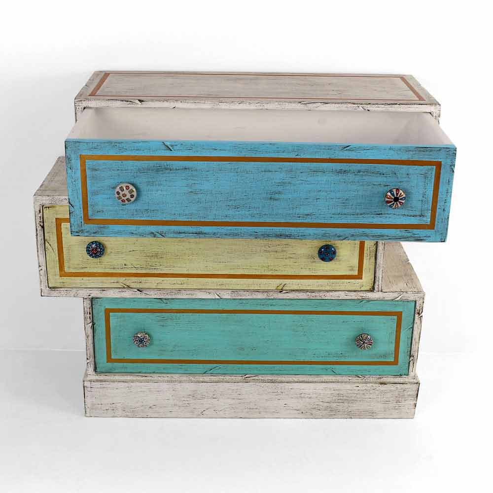 Handgefertigte Kommode in Italien Struktur aus massivem Fichtenholz im Alter von weiß lackiert mit 3 versetzt Schubladen aus Pappelsperrholz mit handbemalten Holzfront und angereichert mit eleganten Details im antiken Gold und Keramik Knöpfen. Die wunderbaren Farben, die das Design dieses Produkts vervollständigen und einzigartig machen, werden durch die Verwendung von natürlichen Flächen erzielt, die mit Klebstoffen tierischen Ursprungs aggregiert sind. Diese Materialien werden als Alternative zu herkömmlichen Industriefarben ausgewählt. Dank dieser Wahl des Herstellers versucht jeder Artikel, das Vorhandensein von Formaldehyd, einem als krebserregend eingestuften Schadstoff, zu minimieren. Die Kommode wird schließlich mit einem transparenten Finish versehen, das sie wasserabweisend macht und die Farben so fixiert, dass sie im Laufe der Zeit unveränderlich sind.