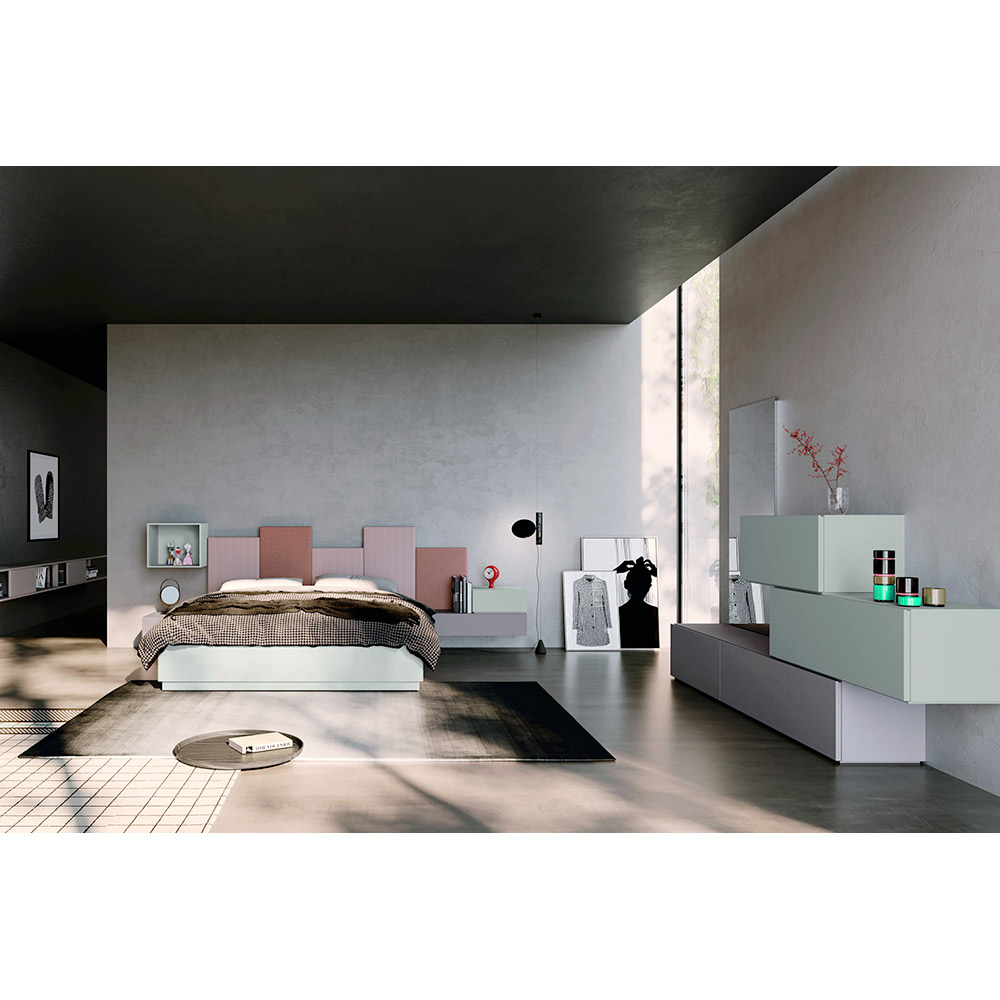 Komplettes Doppelzimmer bestehend aus 5 Elementen, komplett in Italien hergestellt . Die Komposition umfasst ein Doppelbett mit einem Bettgestell aus matt lackiertem Holz mit Federn, zwei Nachttische, einer davon modular, eine Kommode, ebenfalls modular, und eine quadratische Wandeinheit aus matt lackiertem Holz mit Federn Hortensien-Finish. Eine Einrichtungsidee, die dank eines Systems modularer Elemente , die es Ihnen ermöglichen, den Raum an alle Bedürfnisse anzupassen und Ihrer Kreativität und Ihrem persönlichen Geschmack freien Lauf zu lassen, unendliche Möglichkeiten zum Träumen bietet. Das Ergebnis ist eine vollständig anpassbare Umgebung, die einen modernen und vielseitigen Stil gewährleistet, ideal für diejenigen, die ihren Schlafbereich gerne auf exklusive und elegante Weise bereichern.