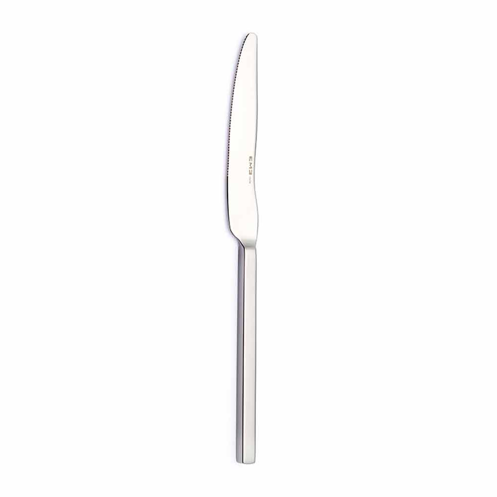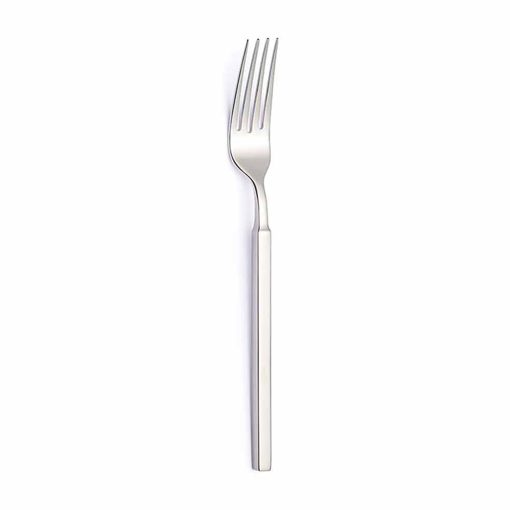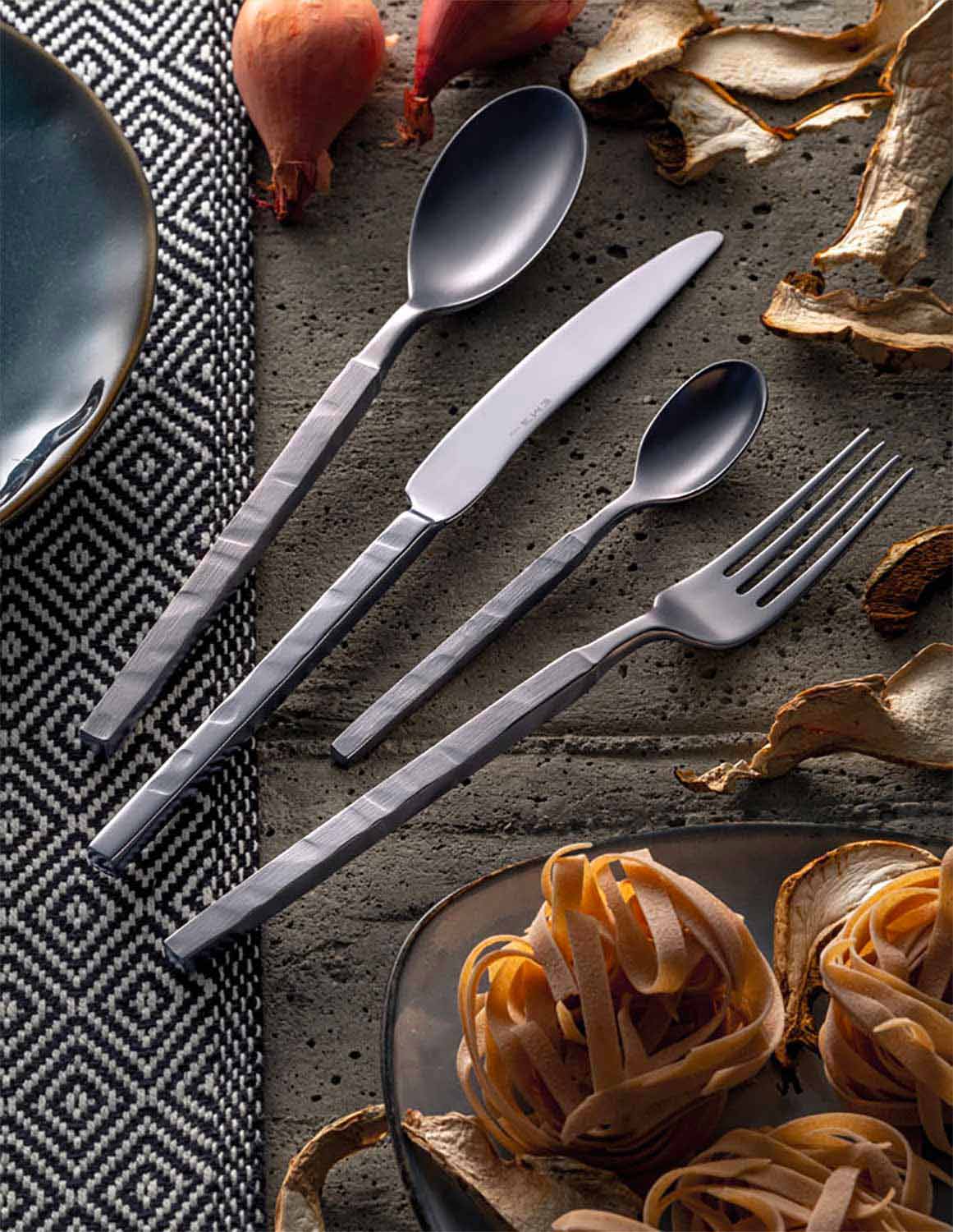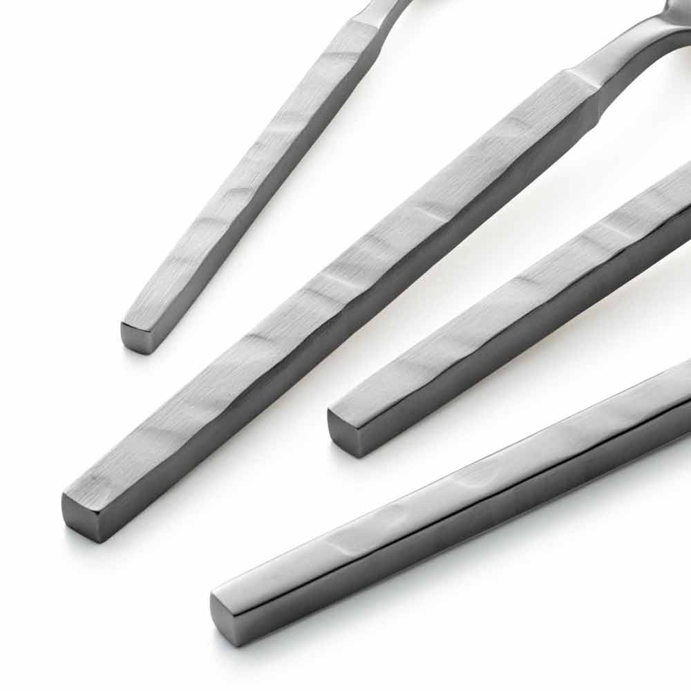 Das quadratische Design und die funktionale Aufmerksamkeit aus geschmiedetem Stahl zeichnen diese Besteckkollektion aus, die von modernen städtischen Räumen inspiriert ist. Die