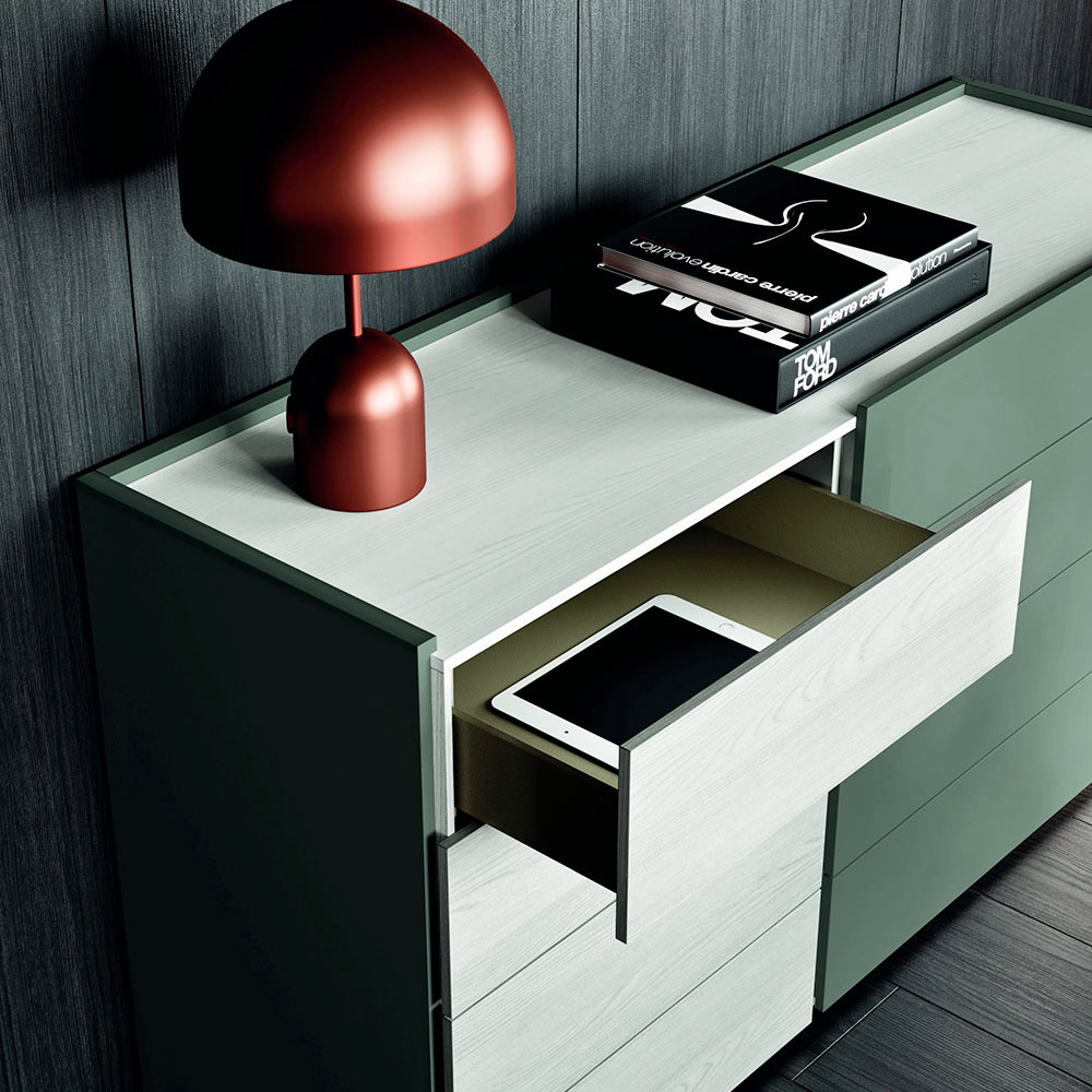 Kommode mit 8 Schubladen in zweifarbiger Ausführung, weiß und matt lackiertem Strukturholz. das Blei. Eine Komposition für die nächtliche Umgebung, die einen regenerierenden und raffinierten Ort zum Leben erweckt, der der Ruhe gewidmet ist und an dem die klaren und frischen Oberflächen an die innere Ruhe erinnern. Das Bett, der Protagonist des Zimmers, zeichnet sich durch ein perfektes