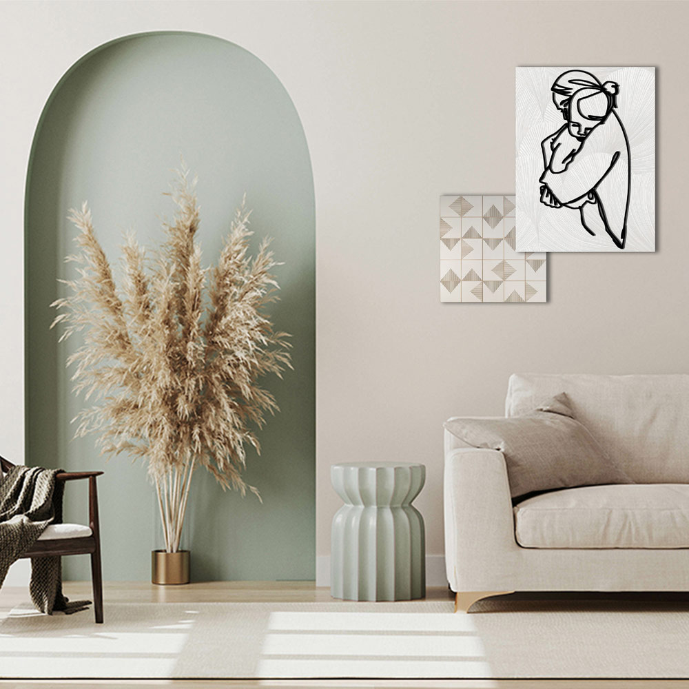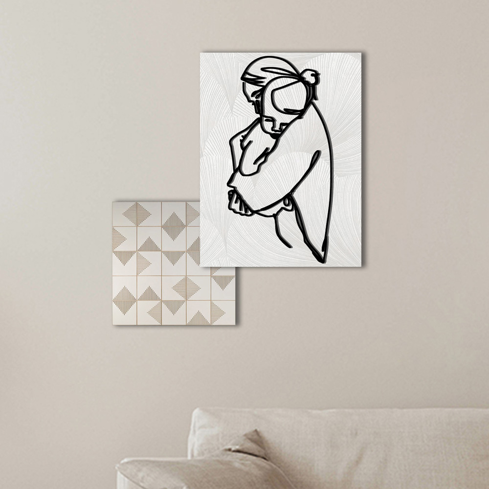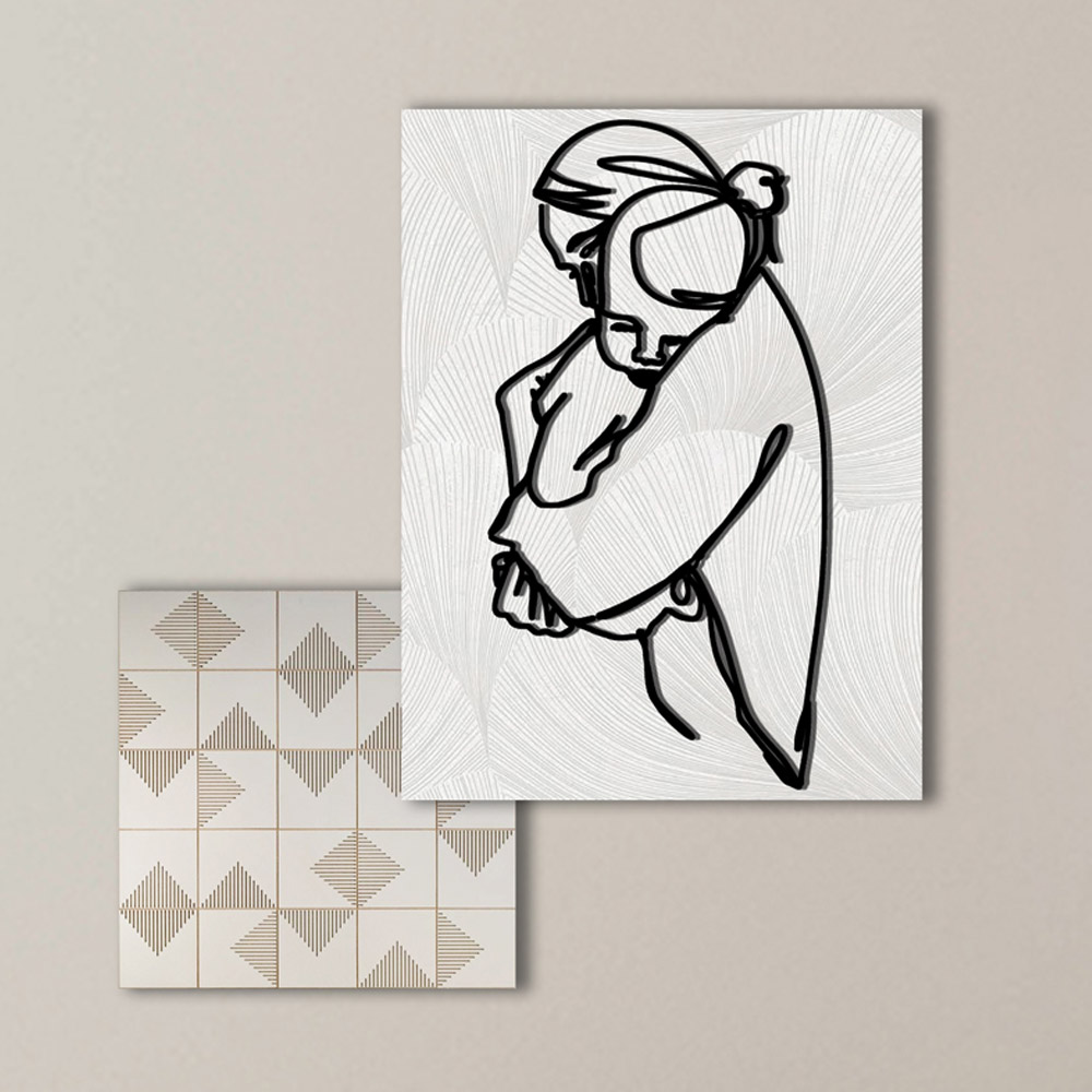 Zusammensetzung aus zwei Tafeln unterschiedlicher Form und Größe, die Laser- und Druckdekorationen kombinieren. Die beiden Gemälde können beliebig, auch einzeln, an der Wand positioniert werden. Bestehend aus 2 bedruckten Holztafeln : eine rechteckige mit Darstellung einer Umarmung zwischen Mutter und Kind und die andere quadratisch mit dreieckigen geometrischen Motiven.