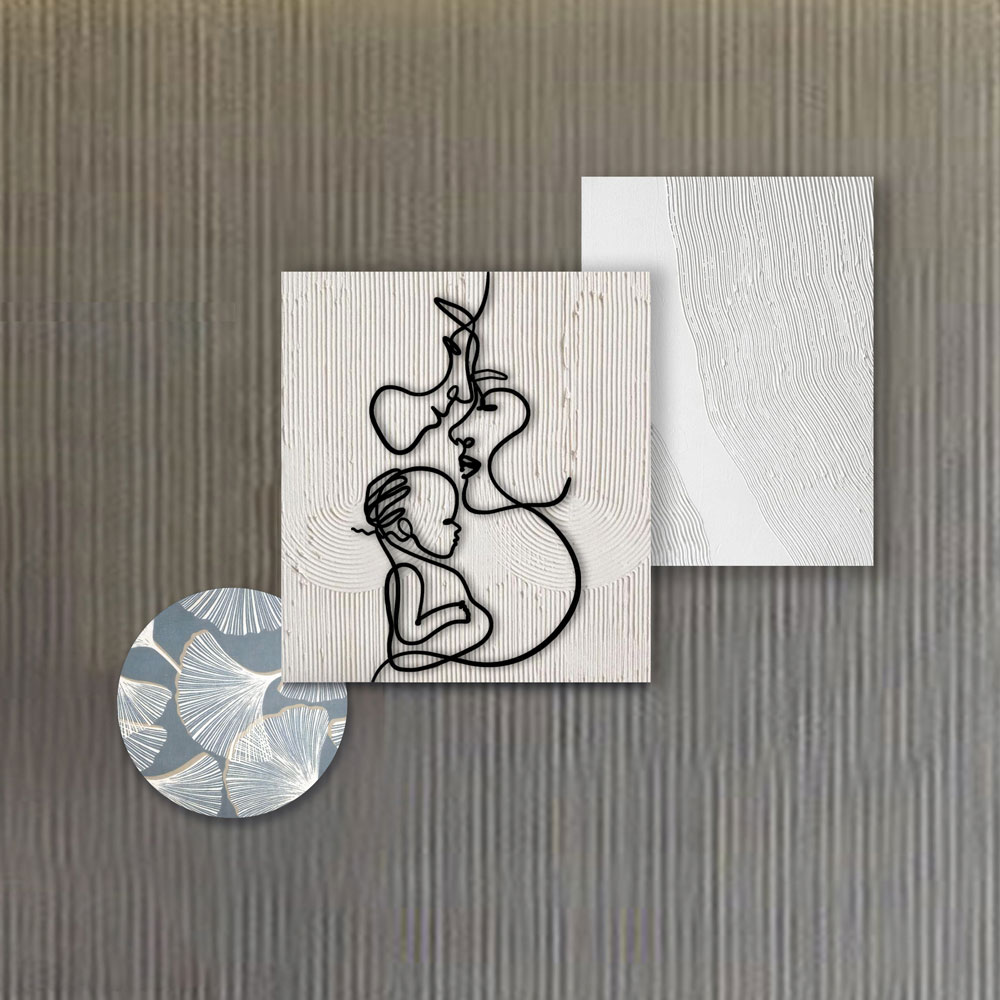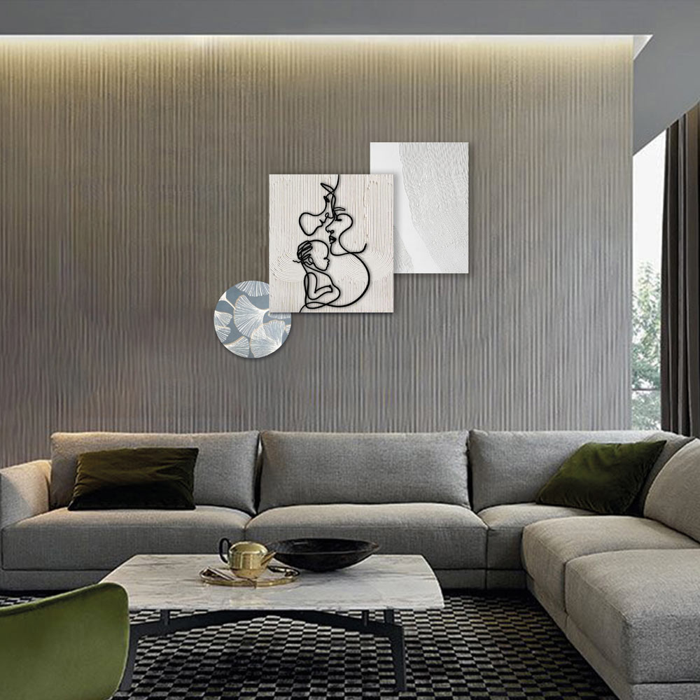 Zusammensetzung aus drei Tafeln unterschiedlicher Form und Größe, die Laser- und Druckdekorationen kombinieren. Bestehend aus drei Tafeln aus bedrucktem Holz : einer runden Tafel mit weißen Blütenblättern, einer rechteckigen Tafel, die die Liebe einer Familie stilisiert, und einer rechteckigen Tafel mit hochreliefierten Linien.