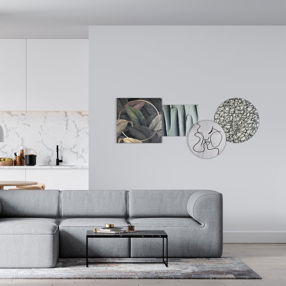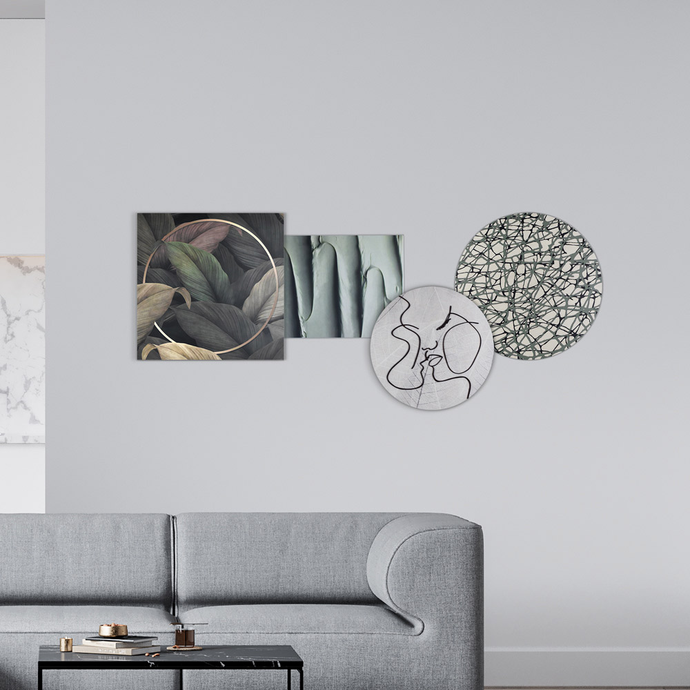 Zusammensetzung aus vier Tafeln unterschiedlicher Form und Größe, die Laser- und Druckdekorationen kombinieren. Bestehend aus vier bedruckten Holztafeln : einer quadratischen mit Blättern, einer rechteckigen mit geschwungenen Linien, einer runden mit der Darstellung des Kusses und einer runden mit ineinander verschlungenen Linien in Grün- und Schwarztönen.