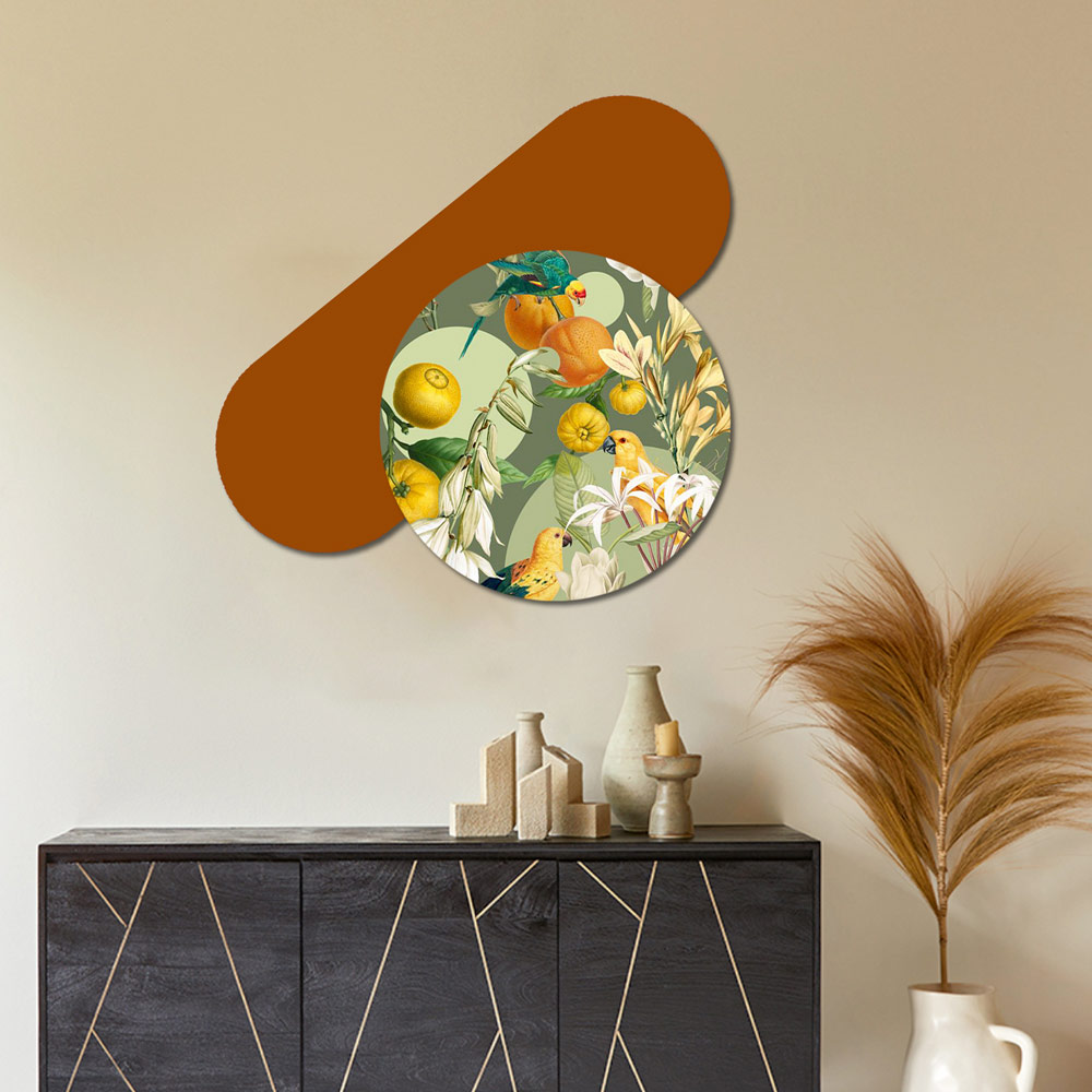 Komposition aus Holztafeln mit Aufdrucken von Papageien und exotischen Früchten.