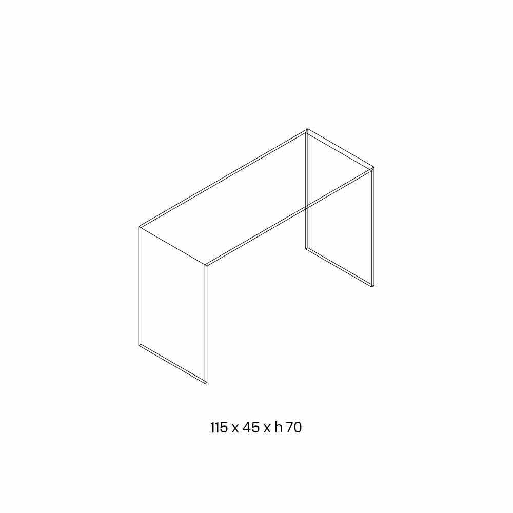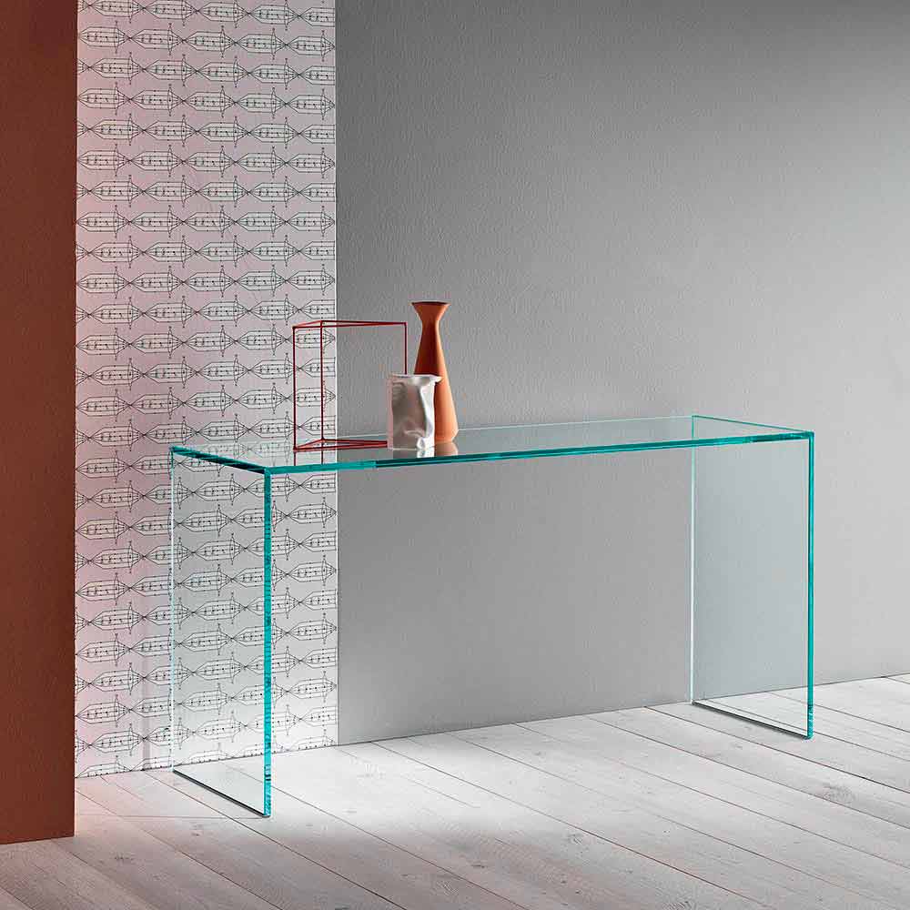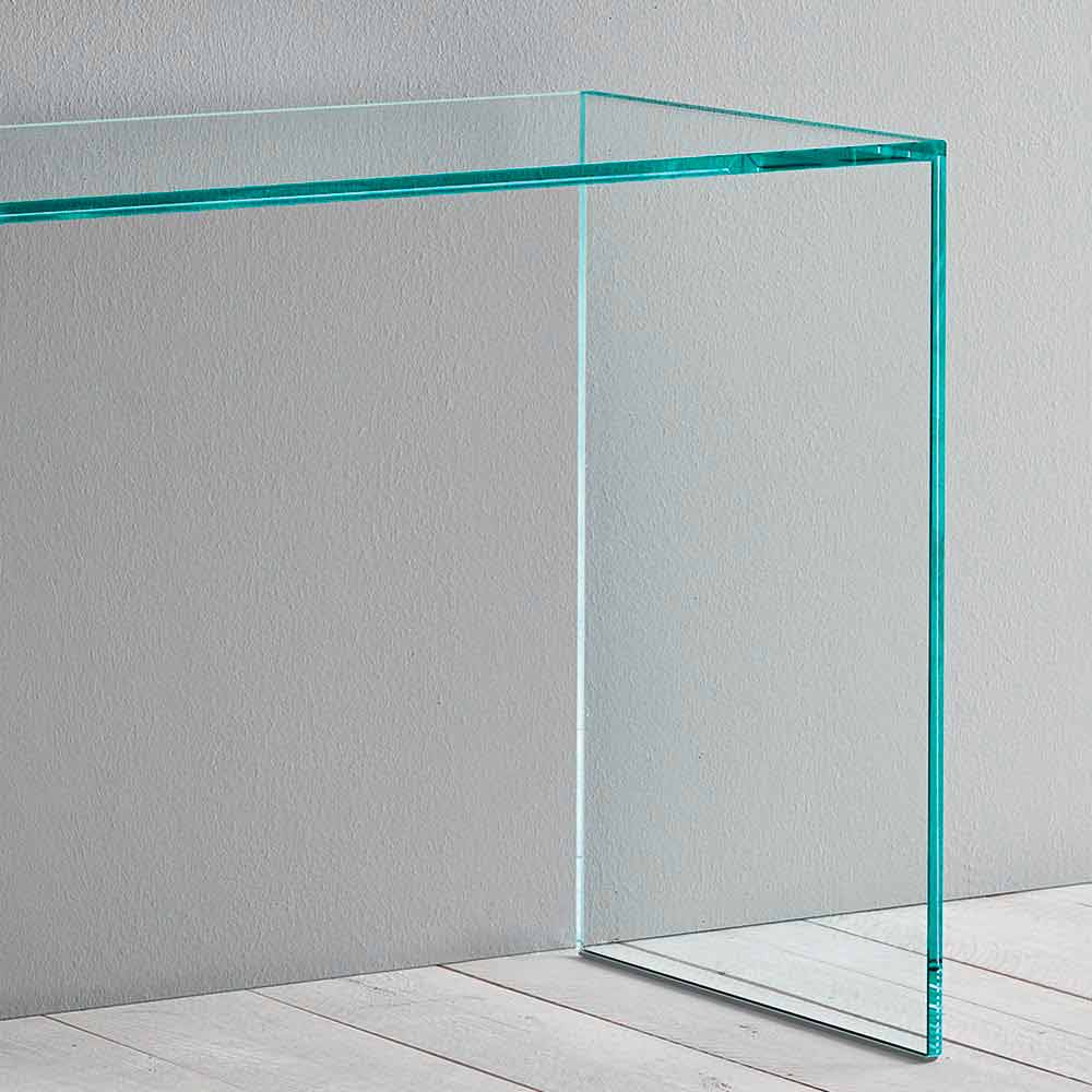 Die Konsole ist ein Möbelstück, das quer in verschiedenen Kontexten verwendet werden kann und eine einfache und lineare Brückenstruktur aufweist, die vollständig aus extraklarem Glas besteht.