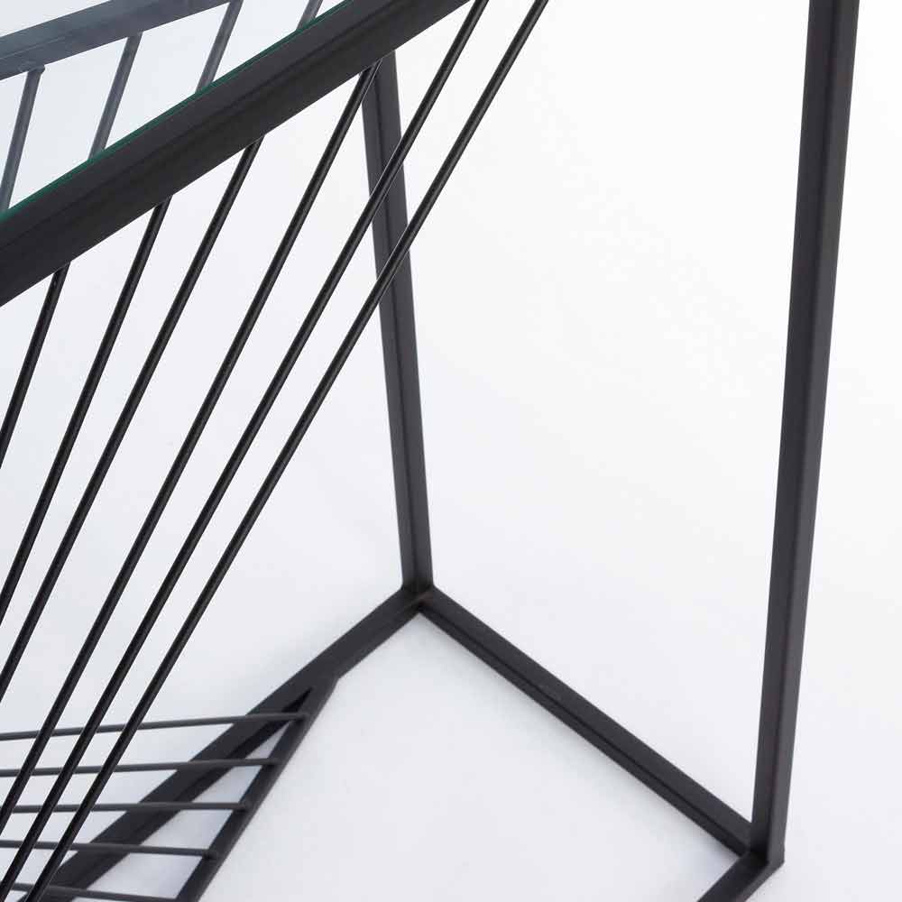 Diese Designkonsole hat eine minimale rechteckige Struktur aus epoxidpulverbeschichtetem Stahl und eine Platte aus gehärtetem Glas .