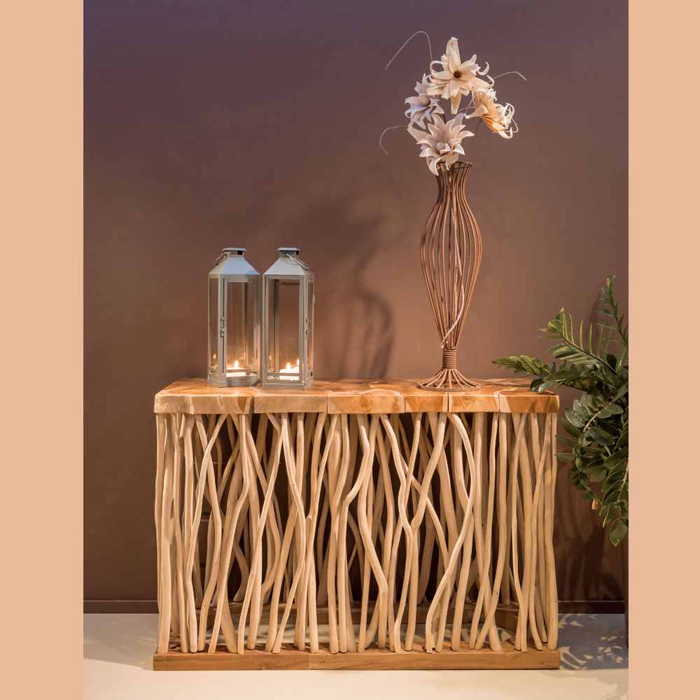 Die handwerkliche Verarbeitung und die Verwendung von Holz in seiner authentischsten Form machen jeden Konsolentisch zu einem Unikat, bei dem die Maserung und die natürlichen Unregelmäßigkeiten zu Elementen von hohem ästhetischem Wert werden.