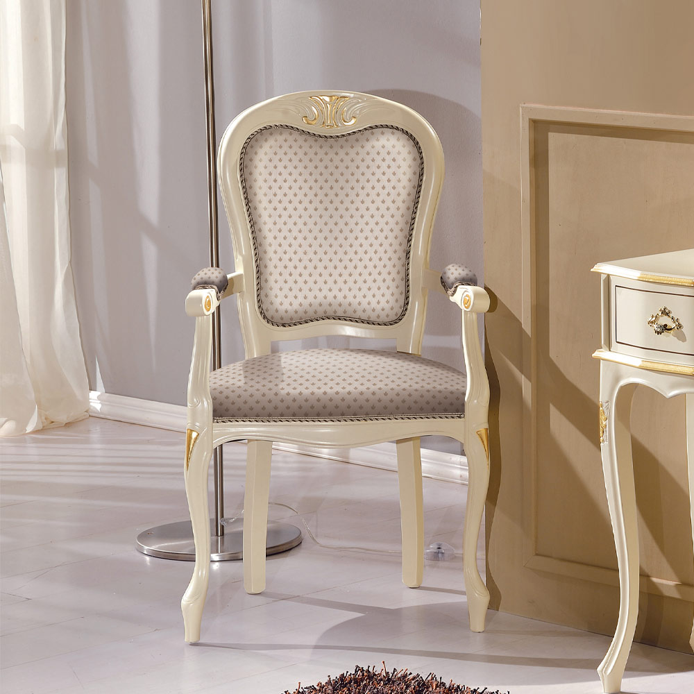 Klassischer Kopf des Tischstuhls aus Edelholz in weißer Ausführung mit gepolsterter Sitzfläche, die mit Stoff bezogen ist, komplett mit praktischen und bequemen Armlehnen. Der gesamte Stil und die Handwerkskunst , die die Verarbeitung auszeichnen, kommen in diesem prächtigen Möbel zum Vorschein und machen es zu einer raffinierten Ergänzung, die in der Lage ist, die Umgebung, in der es aufgestellt wird, zu verschönern. Vollständig in Italien hergestellt und von erfahrenen Handwerksmeistern handgefertigt, vollendet mit Weisheit und Geschmack für Eleganz. Die Produktion erfolgt unter Verwendung hochwertiger Materialien und mit der größten Sorgfalt und Professionalität, die die Produkte Made in Italy auszeichnet .