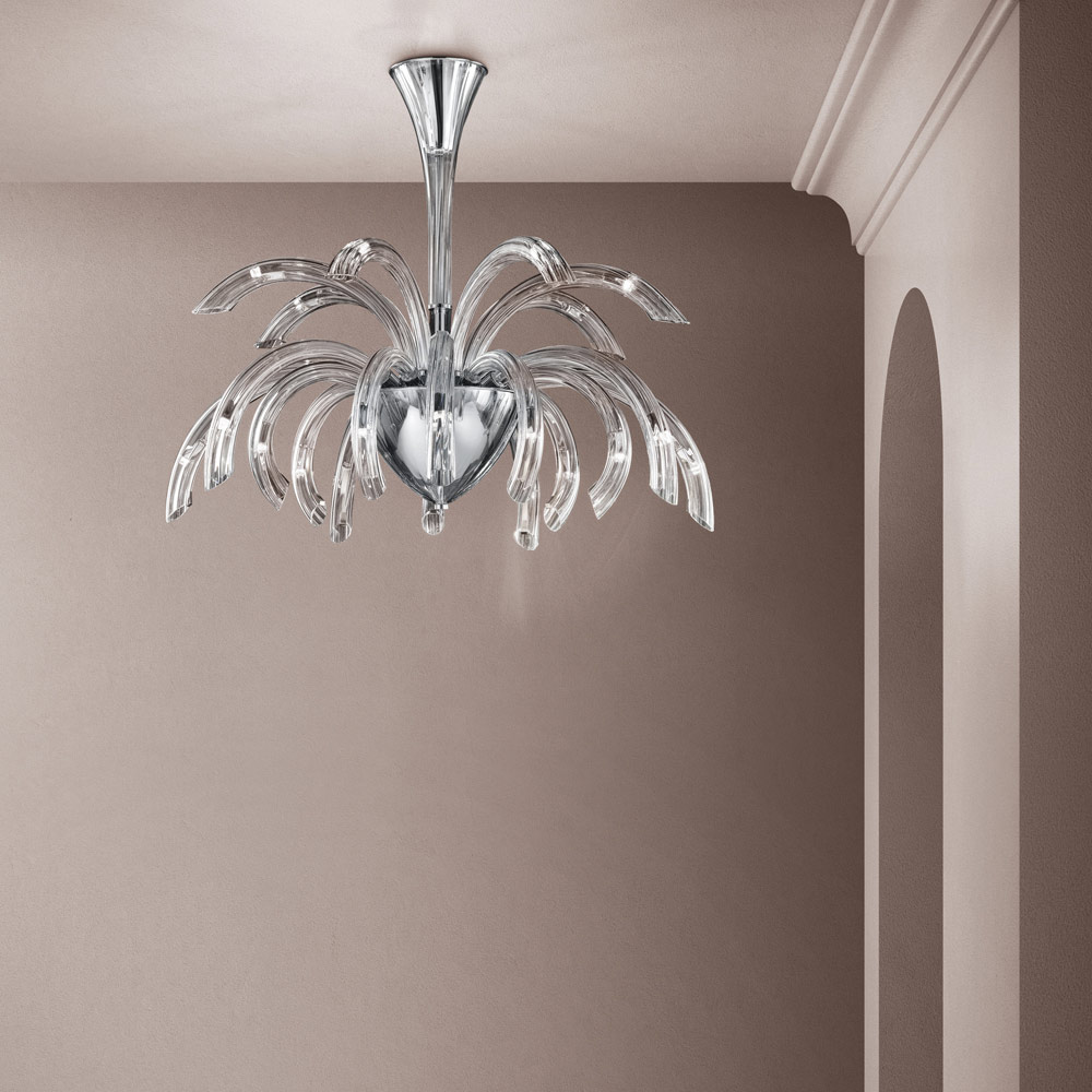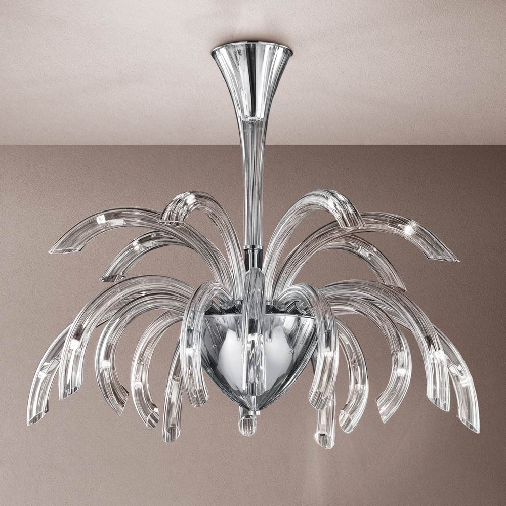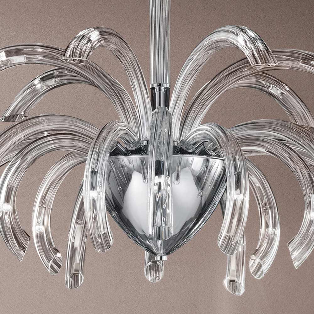 Kronleuchter mit 21 Lichtern aus handgefertigtem Glas aus Venedig mit Kristall-Finish und angereichert mit Details aus verchromtem Metall . Eine faszinierende Ästhetik, die sich dank ihrer Formen und der Funktionalität ihres Designs an jede Art von Umgebung anpasst, in die sie sich mit Überschwänglichkeit einfügt. Die wunderschönen und elegant geschwungenen Arme erweitern sich nach außen, um Licht in verschiedene Richtungen zu bringen und den Raum durch einen originellen szenografischen Effekt zu beleuchten, der an die Explosion eines Feuerwerks erinnert, um ein kreatives , raffiniertes und starkes visuelles Ergebnis zu erzielen.