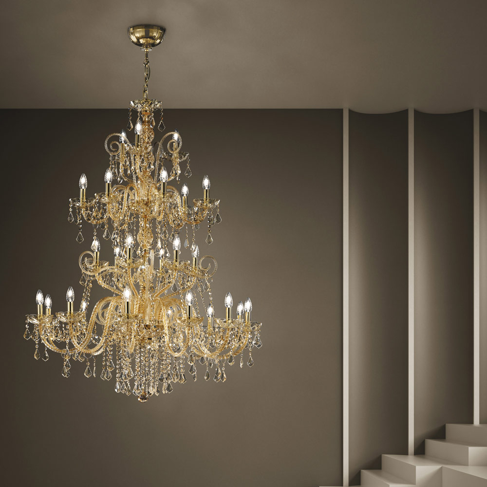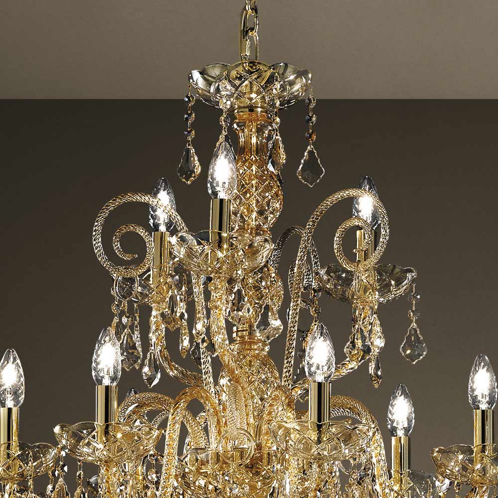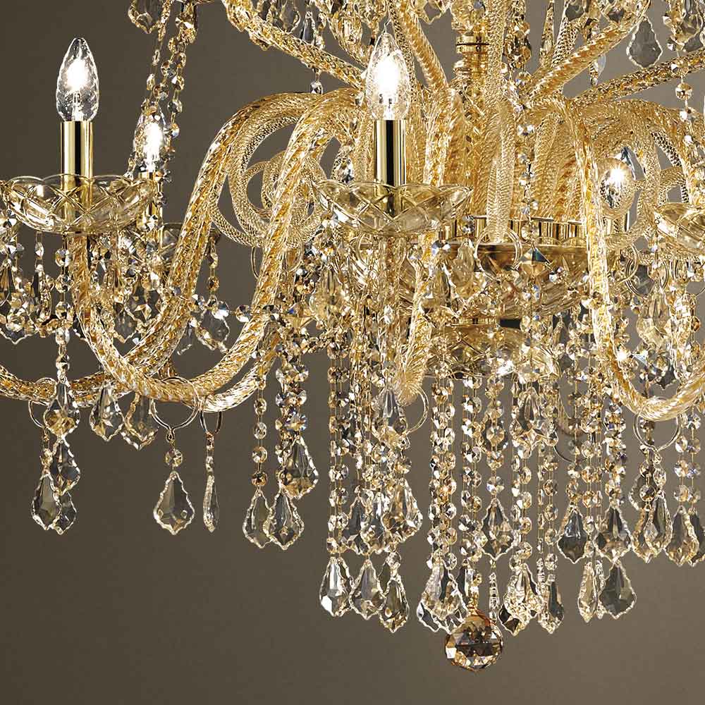 Kronleuchter mit 27 Lichtern aus venezianischem Glas mit bernsteinfarbener Dekoration und nationalen Anhängern und Details aus goldglänzendem Metall . Diese handwerklich hergestellte Ergänzung zeichnet sich durch die wunderbaren Arme aus, die von Hand durch die Verdrehungstechnik bearbeitet wurden, wodurch ein exklusives Ergebnis entsteht, das ästhetisch an die Verflechtung eines Seils erinnert und dem Kronleuchter Persönlichkeit verleiht. Ein echter Lichtregen dringt in die Struktur des Kronleuchters ein und breitet sich dann durch Brechung durch die Magie von Pailletten und Kristallanhängern mit feinen Oberflächen in der Umgebung aus und erzeugt so einen eindrucksvollen und traumhaften szenografischen Effekt , der verzaubern und überraschen kann. für seine Eleganz und Majestät .